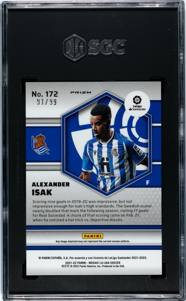 The product is a 2021-22 Panini Mosaic La Liga Mosaic Blue Prizm trading card featuring Alexander Isak from Real Sociedad. This single-parallel card is serial numbered 91/99 and manufactured by Panini America, Inc. It is an original card made of card stock and belongs to the Mosaic Blue Prizm variety in the 2021-22 Panini Mosaic La Liga set. The card is in English language and showcases Alexander Isak as the featured player. This collectible item is ideal for soccer fans and card collectors looking for a unique and limited edition piece to add to their collection.