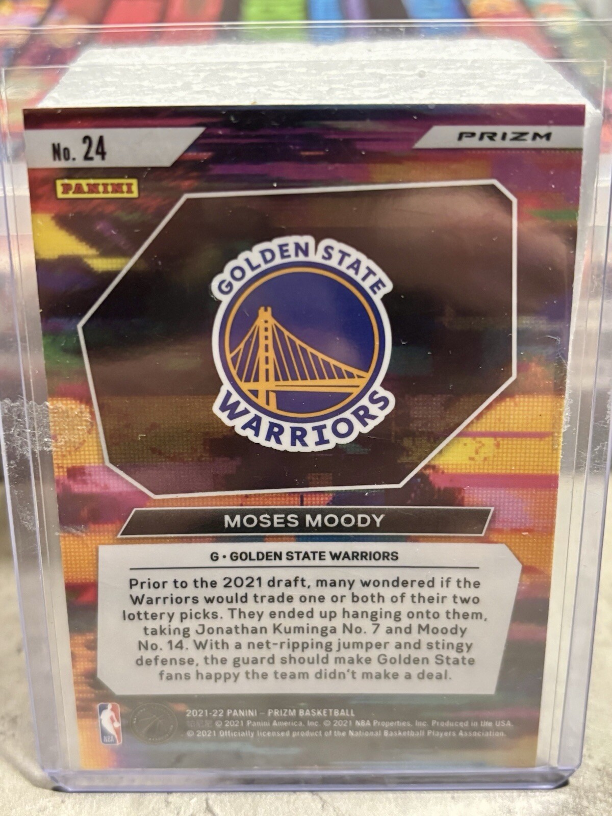 Celebrate the rookie season of Moses Moody with this 2021-22 Panini Prizm Basketball card. Featuring an Instant Impact design, this card showcases the young talent in his Golden State Warriors jersey. A must-have for any NBA trading card collector, this Prizm parallel variety card is sure to be a standout in your collection. Add this numbered card (#24) to your set today and show your support for this rising star.