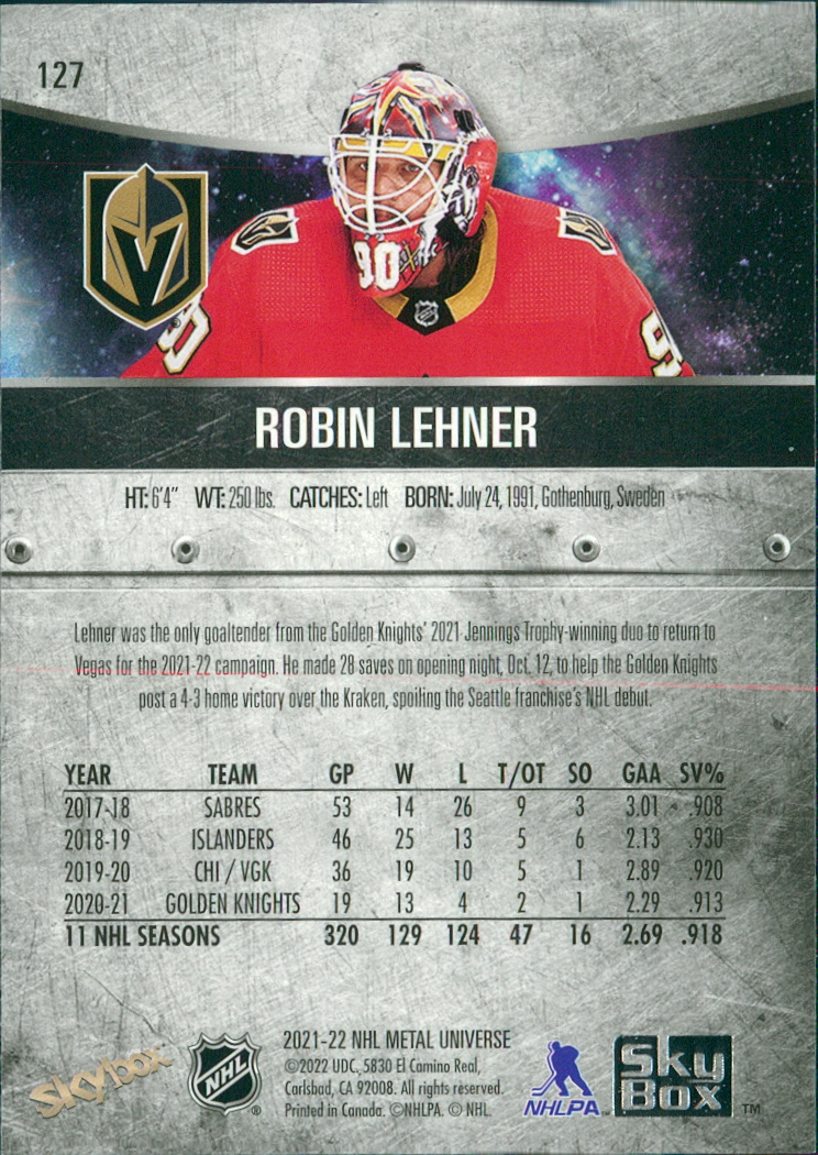 2021-22 Skybox Metal Universe - Alternate Jersey #127 Robin Lehner
