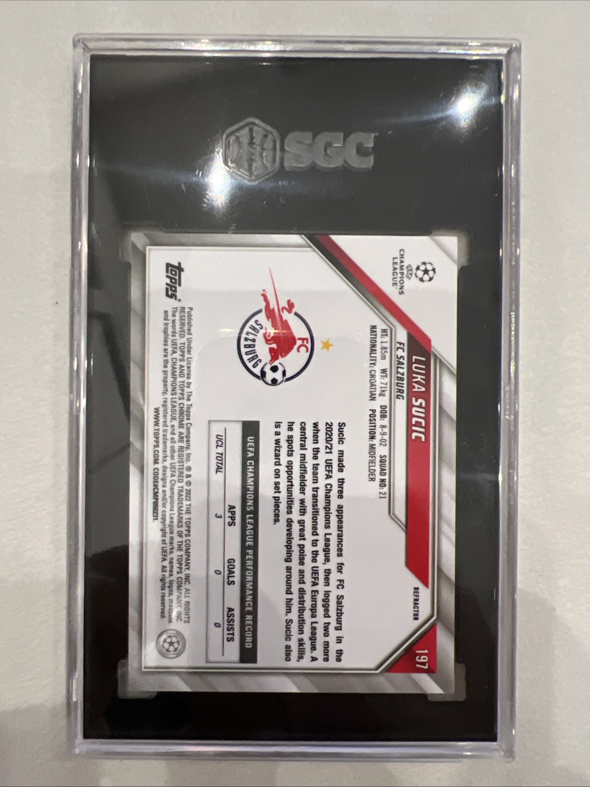 This is a 2021-22 Topps Chrome UCL sports trading card featuring Luka Sucic from the UEFA Champions League. The card is a Refractor parallel variety, graded as a SGC 10 Gem Mint. It is part of the Chrome set and has the card number 197. The card is manufactured by Topps and is specifically designed for sports trading card collectors.
