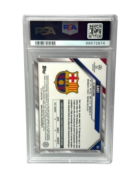 Elevate your soccer card collection with the 2021-22 Topps UCL Collection Starball Foil Gavi #50. This Rookie Card, representing Gavi's debut season with FC Barcelona, is a must-have for fans and collectors alike. The Starball Foil parallel adds an exclusive touch, making it a standout piece. Graded a PSA 10 GEM MT, this card embodies perfection, ensuring it meets the highest standards of quality. Celebrate Gavi's remarkable journey in the UEFA Champions League and own a piece of soccer history with this pristine collectible card.