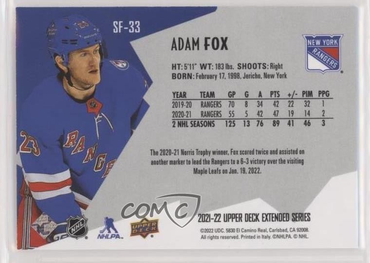 2021-22 Upper Deck Extended Series - SPx Finite - Radiance #SF-33 Adam Fox Qty Made: 799 - Ice Hockey Card - Featuring the New York Rangers - Featuring Adam Fox Search for more: 2021-22 Upper Deck Extended Series Search for more: 2021-22 Upper Deck Extended Series - SPx Finite - Radiance View all of our Listings Auctions Buy It Now About Us Located in the beautiful Pacific Northwest, COMC (Check Out My Cards) is the world's largest consignment service for trading card singles. More than 10,000 people have used our consignment service to list over 50 million trading cards. Find out how we can help you consign your items on eBay by contacting us through eBay messaging. COMC -- "The Safe & Easy Way to Buy & Sell" Representative Image - Select Specific Item above to see image of actual item Representative Image - Select Specific Item above to see image of actual item Raw Condition for Modern Cards Unless otherwise noted, raw modern cards are listed in Near Mint-Mint condition or better. A NM-MT card appears to be Mint at first glance, but upon closer inspection, may exhibit some of the following: minor print defects (e.g. roller marks, print line, dimple), minor scratches, slight edge wear, and slight corner wear. Centering is clearly visible in the images provided and does not factor into our condition assessment. Raw Condition for Vintage Cards Unless otherwise noted, raw vintage cards are listed in Excellent condition or better. An EX card may exhibit some of the following: minor rounding of corners, surface wear, print defects, light scratches, and slight edge wear/chipping. Centering is clearly visible in the images provided and does not factor into our condition assessment. Domestic Shipping Combined shipping for multiple items is available. To receive combined shipping, please ensure all desired items are in your eBay shopping cart before proceeding to checkout. eBay limits orders to 40 items per order. We automatically combine multiple orders placed on the same day. If you place multiple orders on the same day, please contact us to request a refund of applicable shipping costs. Signature confirmation may be required on invoices over $400. All cards are protected and shipped securely. International Shipping COMC offers eBay's International Shipping (EIS) for international orders under $2,500* (see country exceptions below). All duties and import fees are paid at checkout; in the rare event that there are additional import fees upon delivery, these are borne by the buyer. EIS packages route through a shipping hub in Erlanger, KY before shipping to their final destination. Please note that EIS does not allow for combined shipments. The shipping rates are determined by eBay and cannot be adjusted. *Maximum sale price exceptions: Colombia, Kuwait ($2,000); Taiwan ($1,539); Chile, Costa Rica, Guatemala, Honduras, Trinidad and Tobago ($1,000); Antigua and Barbuda, Aruba, Belize, Dominica, Grenada, Philippines, Saint Kitts and Nevis, Saint Lucia, Montserrat, Turks and Caicos Islands ($500); Dominican Republic, El Salvador ($200). Please request a shipping quote through eBay messaging for orders that exceed the maximum sale price supported by eBay's International Shipping. You will be responsible for all duties and import fees for international orders shipped outside the EIS. All cards are protected and shipped securely. Payment COMC does not accept offers on our cards through our eBay storefront. COMC utilizes eBay’s managed payments system. If you are experiencing difficulties making a payment, please contact eBay for assistance. Return Policy Returns are only accepted on the rare occasion the item is not as described. If you are making a return, please initiate the return process through eBay so a mailing label can be provided for you. Prior to listing, our expert team carefully assessed this item to represent it accurately. Please review the description and high-definition images prior to purchasing to ensure this item meets your satisfaction. We welcome you to contact us if you have further questions about this item. Trust and Integrity COMC carefully assesses each item consigned to us to prevent fraudulent items from entering the marketplace. If you believe an item offered on COMC may be fraudulent, please contact us with details so we can investigate the issue. Items we determine are outside our supported items policy may be removed. Last Modified: 6/28/2025 6:42:54 AM PDT