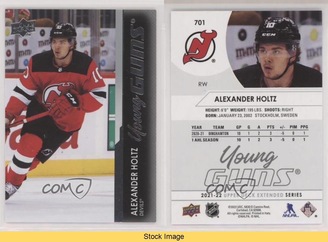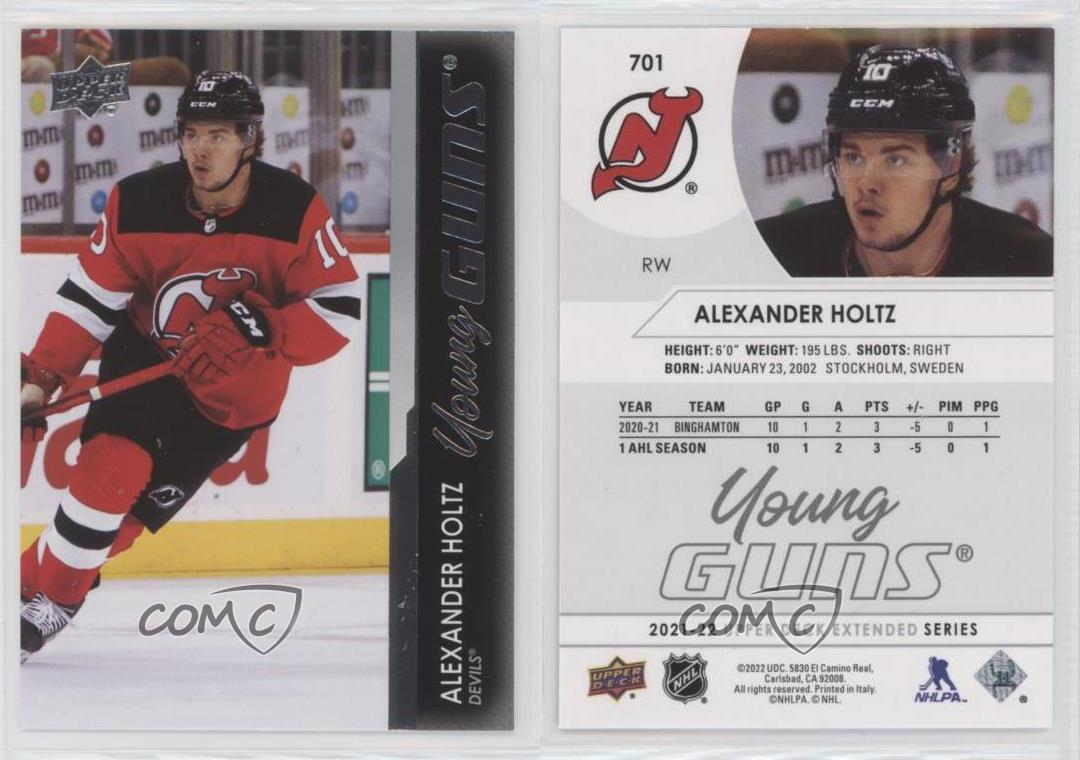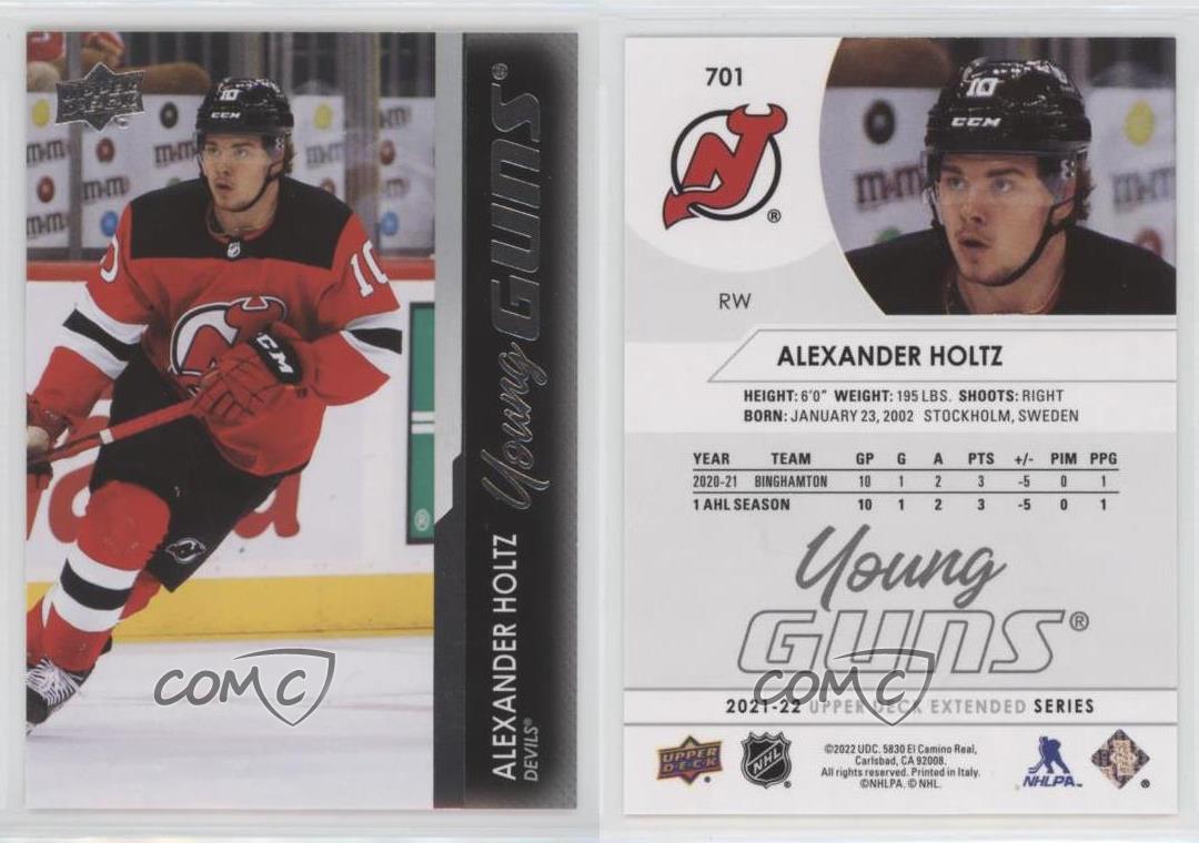 2021-22 Upper Deck Extended Series - [Base] #701 Young Guns - Alexander Holtz - RC (Rookie Card) - Ice Hockey Card - Featuring the New Jersey Devils - Featuring Alexander Holtz Search for more: 2021-22 Upper Deck Extended Series Search for more: 2021-22 Upper Deck Extended Series - [Base] View all of our Listings Auctions Buy It Now About Us Located in the beautiful Pacific Northwest, COMC (Check Out My Cards) is the world's largest consignment service for trading card singles. More than 10,000 people have used our consignment service to list over 50 million trading cards. Find out how we can help you consign your items on eBay by contacting us through eBay messaging. COMC -- "The Safe & Easy Way to Buy & Sell" Representative Image - Select Specific Item above to see image of actual item Representative Image - Select Specific Item above to see image of actual item Raw Condition for Modern Cards Unless otherwise noted, raw modern cards are listed in Near Mint-Mint condition or better. A NM-MT card appears to be Mint at first glance, but upon closer inspection, may exhibit some of the following: minor print defects (e.g. roller marks, print line, dimple), minor scratches, slight edge wear, and slight corner wear. Centering is clearly visible in the images provided and does not factor into our condition assessment. Raw Condition for Vintage Cards Unless otherwise noted, raw vintage cards are listed in Excellent condition or better. An EX card may exhibit some of the following: minor rounding of corners, surface wear, print defects, light scratches, and slight edge wear/chipping. Centering is clearly visible in the images provided and does not factor into our condition assessment. Domestic Shipping Combined shipping for multiple items is available. To receive combined shipping, please ensure all desired items are in your eBay shopping cart before proceeding to checkout. eBay limits orders to 40 items per order. We automatically combine multiple orders placed on the same day. If you place multiple orders on the same day, please contact us to request a refund of applicable shipping costs. Signature confirmation may be required on invoices over $400. All cards are protected and shipped securely. International Shipping COMC offers eBay's International Shipping (EIS) for international orders under $2,500* (see country exceptions below). All duties and import fees are paid at checkout; in the rare event that there are additional import fees upon delivery, these are borne by the buyer. EIS packages route through a shipping hub in Erlanger, KY before shipping to their final destination. Please note that EIS does not allow for combined shipments. The shipping rates are determined by eBay and cannot be adjusted. *Maximum sale price exceptions: Colombia, Kuwait ($2,000); Taiwan ($1,539); Chile, Costa Rica, Guatemala, Honduras, Trinidad and Tobago ($1,000); Antigua and Barbuda, Aruba, Belize, Dominica, Grenada, Philippines, Saint Kitts and Nevis, Saint Lucia, Montserrat, Turks and Caicos Islands ($500); Dominican Republic, El Salvador ($200). Please request a shipping quote through eBay messaging for orders that exceed the maximum sale price supported by eBay's International Shipping. You will be responsible for all duties and import fees for international orders shipped outside the EIS. All cards are protected and shipped securely. Payment COMC does not accept offers on our cards through our eBay storefront. COMC utilizes eBay’s managed payments system. If you are experiencing difficulties making a payment, please contact eBay for assistance. Return Policy Returns are only accepted on the rare occasion the item is not as described. If you are making a return, please initiate the return process through eBay so a mailing label can be provided for you. Prior to listing, our expert team carefully assessed this item to represent it accurately. Please review the description and high-definition images prior to purchasing to ensure this item meets your satisfaction. We welcome you to contact us if you have further questions about this item. Trust and Integrity COMC carefully assesses each item consigned to us to prevent fraudulent items from entering the marketplace. If you believe an item offered on COMC may be fraudulent, please contact us with details so we can investigate the issue. Items we determine are outside our supported items policy may be removed. Last Modified: 6/26/2025 12:39:35 AM PDT