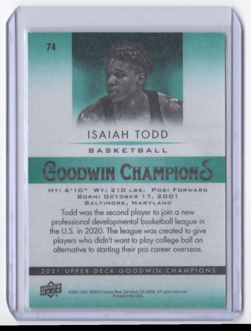 This Isaiah Todd rookie card from 2021-22 UD Goodwin Champions is a sharp addition to any basketball collection! The crisp action shot and clean design make it stand out, while the sturdy cardstock ensures it stays in great condition. Perfect for fans of rising NBA talent or Goodwin Champions collectors. A must-have for those chasing future stars!