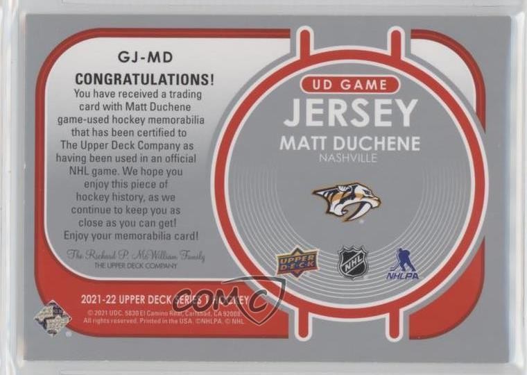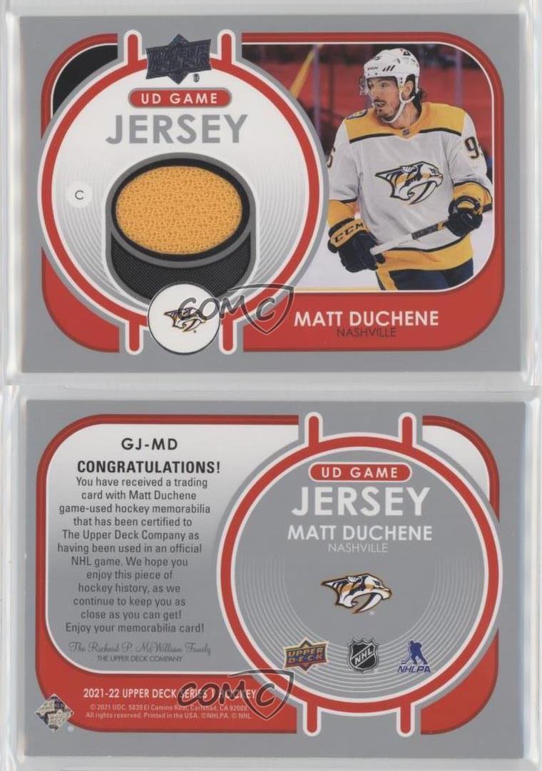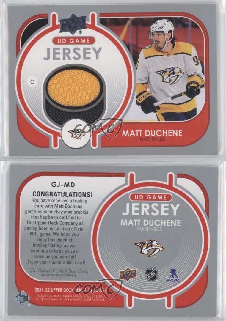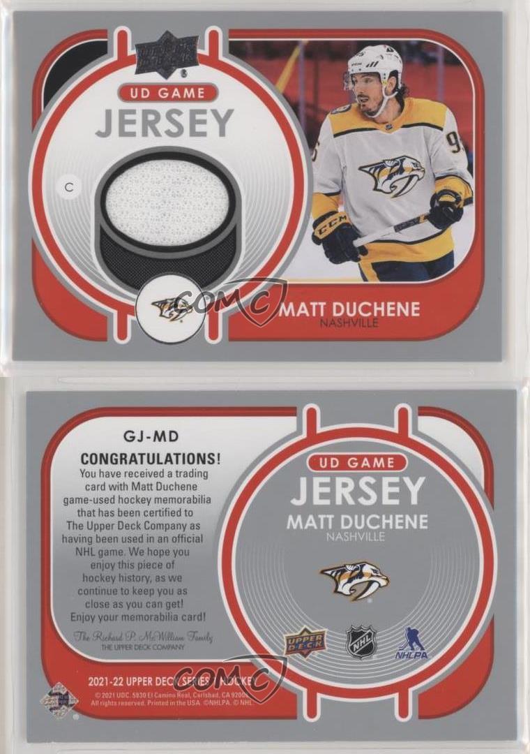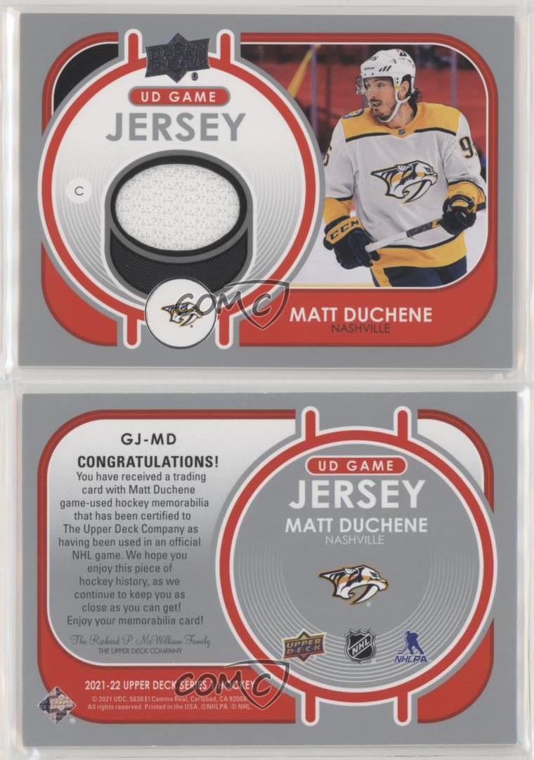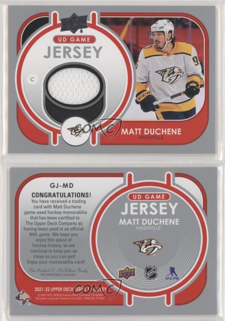 2021-22 Upper Deck Series 1 - UD Game Jersey #GJ-MD Matt Duchene - Ice Hockey Card - Featuring the Nashville Predators - Featuring Matt Duchene Search for more: 2021-22 Upper Deck Series 1 Search for more: 2021-22 Upper Deck Series 1 - UD Game Jersey View all of our Listings Auctions Buy It Now About Us Located in the beautiful Pacific Northwest, COMC (Check Out My Cards) is the world's largest consignment service for trading card singles. More than 10,000 people have used our consignment service to list over 50 million trading cards. Find out how we can help you consign your items on eBay by contacting us through eBay messaging. COMC -- "The Safe & Easy Way to Buy & Sell" Representative Image - Select Specific Item above to see image of actual item Representative Image - Select Specific Item above to see image of actual item Raw Condition for Modern Cards Unless otherwise noted, raw modern cards are listed in Near Mint-Mint condition or better. A NM-MT card appears to be Mint at first glance, but upon closer inspection, may exhibit some of the following: minor print defects (e.g. roller marks, print line, dimple), minor scratches, slight edge wear, and slight corner wear. Centering is clearly visible in the images provided and does not factor into our condition assessment. Raw Condition for Vintage Cards Unless otherwise noted, raw vintage cards are listed in Excellent condition or better. An EX card may exhibit some of the following: minor rounding of corners, surface wear, print defects, light scratches, and slight edge wear/chipping. Centering is clearly visible in the images provided and does not factor into our condition assessment. Domestic Shipping Combined shipping for multiple items is available. To receive combined shipping, please ensure all desired items are in your eBay shopping cart before proceeding to checkout. eBay limits orders to 40 items per order. We automatically combine multiple orders placed on the same day. If you place multiple orders on the same day, please contact us to request a refund of applicable shipping costs. Signature confirmation may be required on invoices over $400. All cards are protected and shipped securely. International Shipping COMC offers eBay's International Shipping (EIS) for international orders under $2,500* (see country exceptions below). All duties and import fees are paid at checkout; in the rare event that there are additional import fees upon delivery, these are borne by the buyer. EIS packages route through a shipping hub in Erlanger, KY before shipping to their final destination. Please note that EIS does not allow for combined shipments. The shipping rates are determined by eBay and cannot be adjusted. *Maximum sale price exceptions: Colombia, Kuwait ($2,000); Taiwan ($1,539); Chile, Costa Rica, Guatemala, Honduras, Trinidad and Tobago ($1,000); Antigua and Barbuda, Aruba, Belize, Dominica, Grenada, Philippines, Saint Kitts and Nevis, Saint Lucia, Montserrat, Turks and Caicos Islands ($500); Dominican Republic, El Salvador ($200). Please request a shipping quote through eBay messaging for orders that exceed the maximum sale price supported by eBay's International Shipping. You will be responsible for all duties and import fees for international orders shipped outside the EIS. All cards are protected and shipped securely. Payment COMC does not accept offers on our cards through our eBay storefront. COMC utilizes eBay’s managed payments system. If you are experiencing difficulties making a payment, please contact eBay for assistance. Return Policy Returns are only accepted on the rare occasion the item is not as described. If you are making a return, please initiate the return process through eBay so a mailing label can be provided for you. Prior to listing, our expert team carefully assessed this item to represent it accurately. Please review the description and high-definition images prior to purchasing to ensure this item meets your satisfaction. We welcome you to contact us if you have further questions about this item. Trust and Integrity COMC carefully assesses each item consigned to us to prevent fraudulent items from entering the marketplace. If you believe an item offered on COMC may be fraudulent, please contact us with details so we can investigate the issue. Items we determine are outside our supported items policy may be removed. Last Modified: 6/29/2025 6:30:16 PM PDT
