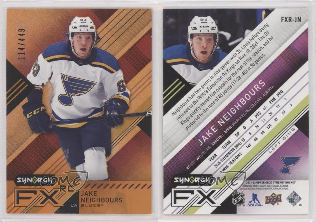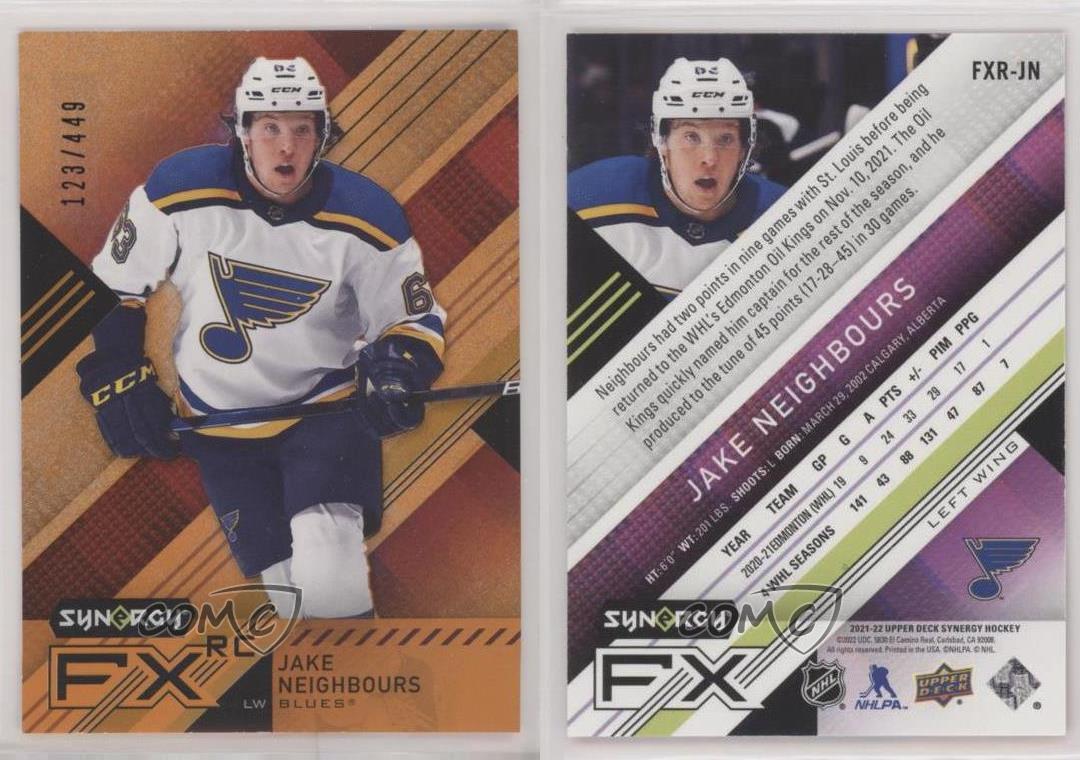 2021-22 Upper Deck Synergy - Synergy FX Rookies - Orange #FXR-JN Jake Neighbours Qty Made: 449 - Rookie - Ice Hockey Card - Featuring the St. Louis Blues - Featuring Jake Neighbours Search for more: 2021-22 Upper Deck Synergy Search for more: 2021-22 Upper Deck Synergy - Synergy FX Rookies - Orange View all of our Listings Auctions Buy It Now About Us Located in the beautiful Pacific Northwest, COMC (Check Out My Cards) is the world's largest consignment service for trading card singles. More than 10,000 people have used our consignment service to list over 50 million trading cards. Find out how we can help you consign your items on eBay by contacting us through eBay messaging. COMC -- "The Safe & Easy Way to Buy & Sell" Representative Image - Select Specific Item above to see image of actual item Representative Image - Select Specific Item above to see image of actual item Raw Condition for Modern Cards Unless otherwise noted, raw modern cards are listed in Near Mint-Mint condition or better. A NM-MT card appears to be Mint at first glance, but upon closer inspection, may exhibit some of the following: minor print defects (e.g. roller marks, print line, dimple), minor scratches, slight edge wear, and slight corner wear. Centering is clearly visible in the images provided and does not factor into our condition assessment. Raw Condition for Vintage Cards Unless otherwise noted, raw vintage cards are listed in Excellent condition or better. An EX card may exhibit some of the following: minor rounding of corners, surface wear, print defects, light scratches, and slight edge wear/chipping. Centering is clearly visible in the images provided and does not factor into our condition assessment. Domestic Shipping Combined shipping for multiple items is available. To receive combined shipping, please ensure all desired items are in your eBay shopping cart before proceeding to checkout. eBay limits orders to 40 items per order. We automatically combine multiple orders placed on the same day. If you place multiple orders on the same day, please contact us to request a refund of applicable shipping costs. Signature confirmation may be required on invoices over $400. All cards are protected and shipped securely. International Shipping COMC offers eBay's International Shipping (EIS) for international orders under $2,500* (see country exceptions below). All duties and import fees are paid at checkout; in the rare event that there are additional import fees upon delivery, these are borne by the buyer. EIS packages route through a shipping hub in Erlanger, KY before shipping to their final destination. Please note that EIS does not allow for combined shipments. The shipping rates are determined by eBay and cannot be adjusted. *Maximum sale price exceptions: Colombia, Kuwait ($2,000); Taiwan ($1,539); Chile, Costa Rica, Guatemala, Honduras, Trinidad and Tobago ($1,000); Antigua and Barbuda, Aruba, Belize, Dominica, Grenada, Philippines, Saint Kitts and Nevis, Saint Lucia, Montserrat, Turks and Caicos Islands ($500); Dominican Republic, El Salvador ($200). Please request a shipping quote through eBay messaging for orders that exceed the maximum sale price supported by eBay's International Shipping. You will be responsible for all duties and import fees for international orders shipped outside the EIS. All cards are protected and shipped securely. Payment COMC does not accept offers on our cards through our eBay storefront. COMC utilizes eBay’s managed payments system. If you are experiencing difficulties making a payment, please contact eBay for assistance. Return Policy Returns are only accepted on the rare occasion the item is not as described. If you are making a return, please initiate the return process through eBay so a mailing label can be provided for you. Prior to listing, our expert team carefully assessed this item to represent it accurately. Please review the description and high-definition images prior to purchasing to ensure this item meets your satisfaction. We welcome you to contact us if you have further questions about this item. Trust and Integrity COMC carefully assesses each item consigned to us to prevent fraudulent items from entering the marketplace. If you believe an item offered on COMC may be fraudulent, please contact us with details so we can investigate the issue. Items we determine are outside our supported items policy may be removed. Last Modified: 6/23/2025 6:40:54 PM PDT