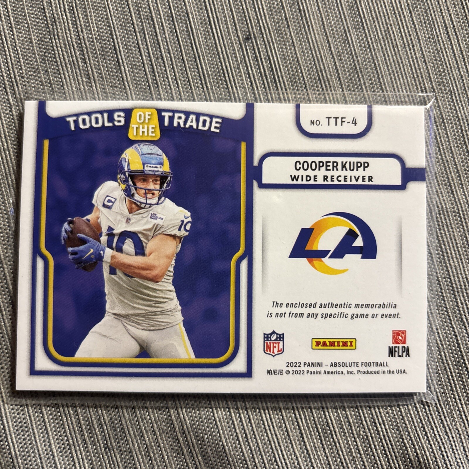 Elevate your collection with the 2022 Absolute Cooper Kupp Tools of the Trade 5 Patch card. This coveted piece from Panini features a stunning array of memorabilia, with an eye-catching patch design. Serial numbered LAR-13/25, this card is a limited edition gem that celebrates the exceptional talent of Los Angeles Rams' star wide receiver, Cooper Kupp. Crafted for the dedicated football enthusiast, this card belongs to the esteemed 2022 Absolute Football set and is a must-have for those who appreciate the intricate details of sports memorabilia. The card, marked as TTF-4, is a testimony to Kupp's athletic prowess and is an essential addition for collectors and fans alike, encapsulating a season of remarkable achievements on the field.