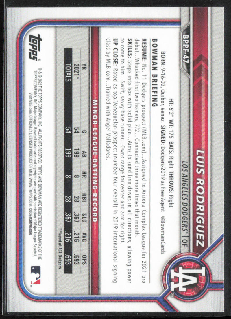 2022 Bowman 1st Edition Luis Rodriguez Shy Blue Foil #BPPF-47 (RC) LA Angels. Condition is Ungraded. Shipped with eBay Standard Envelope for Eligible Items up to $20.