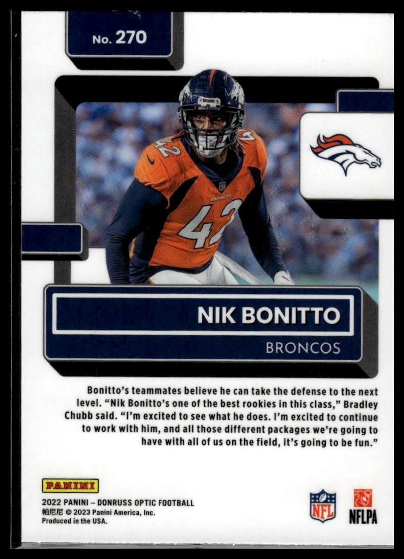 This is a nice example of a 2022 Donruss Optic #270 Nik Bonitto Other important information about this card: Rated Rookie RC,Chase,Checklist,Parallel,SP In 2022 Nik Bonitto played for the Denver Broncos. Please check out our other listings for more great cards.