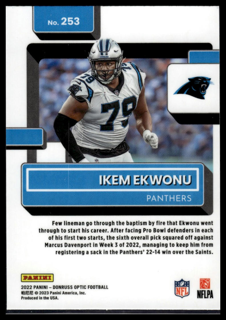 This is a nice example of a 2022 Donruss Optic #253 Ikem Ekwonu Other important information about this card: Rated Rookie RC,Chase,Checklist,Parallel,SP In 2022 Ikem Ekwonu played for the Carolina Panthers. Please check out our other listings for more great cards.