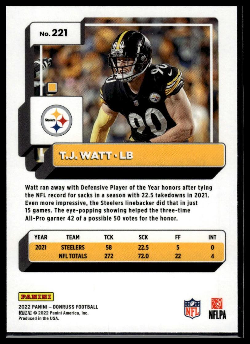 This is a nice example of a 2022 Donruss #221 T.J. Watt Blue Press Proof Other important information about this card: Chase,Checklist,Parallel,Insert,SP In 2022 T.J. Watt played for the Pittsburgh Steelers. Please check out our other listings for more great cards.