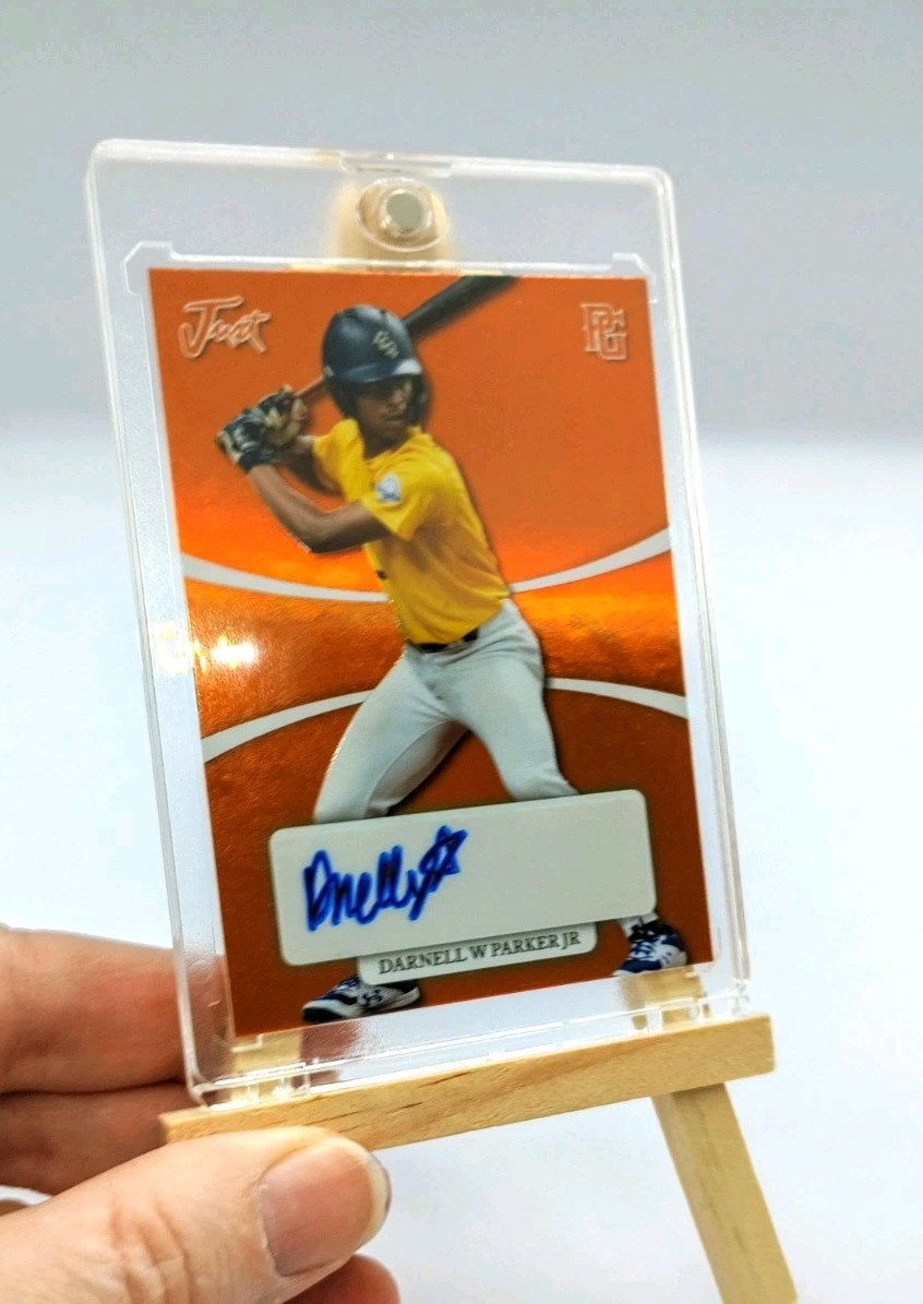 The 2022 Leaf Perfect Game National Showcase Just Minors Gems Autographs trading card features an autograph from Darnell W Parker Jr, signed on a label or sticker. This limited edition card is part of the 2022 Leaf Perfect Game National Showcase set and is serial numbered out of 10. As a member of the Perfect Game All American team, Darnell W Parker Jr is a rising star in baseball, making this autographed card a valuable addition to any sports trading card collection. 05/21