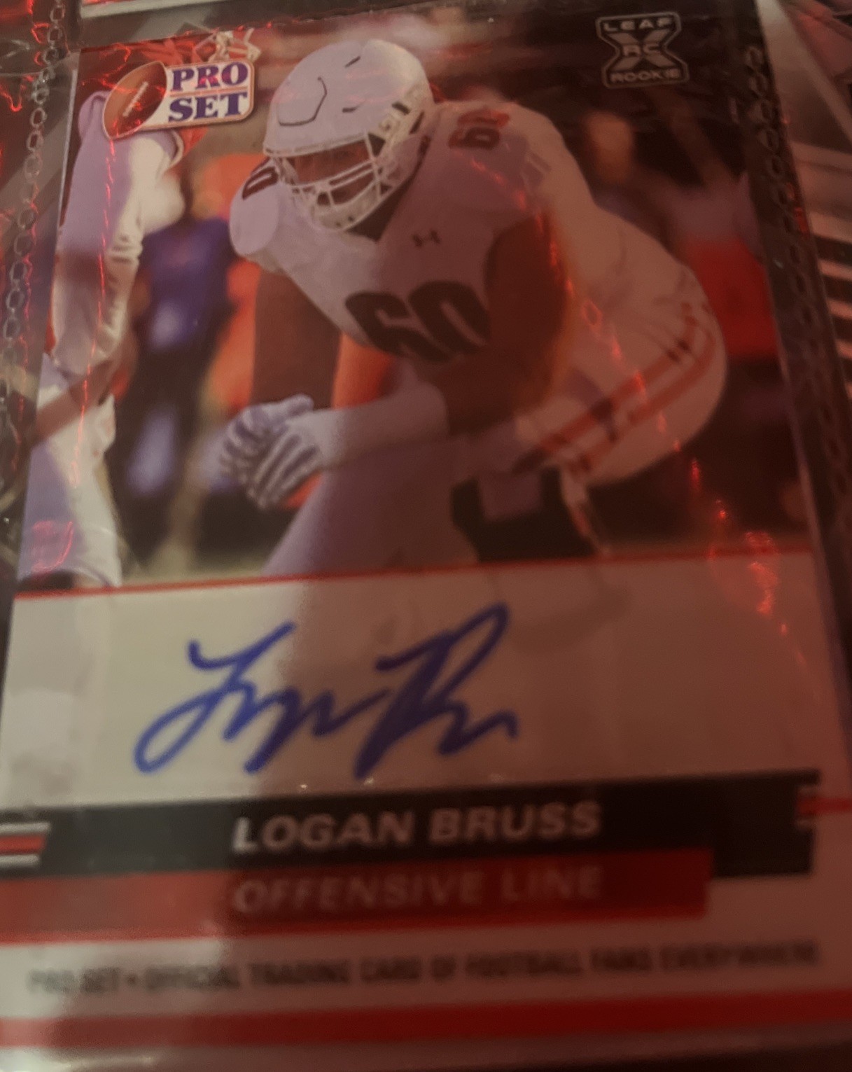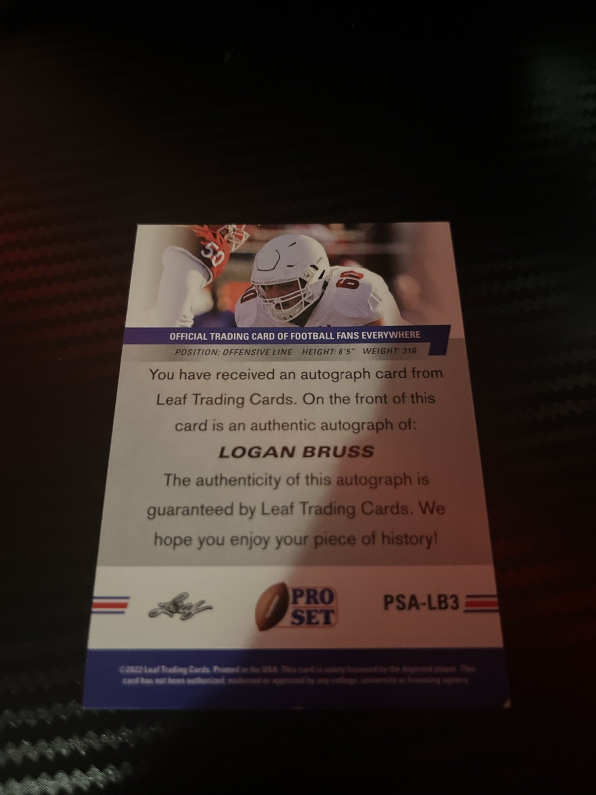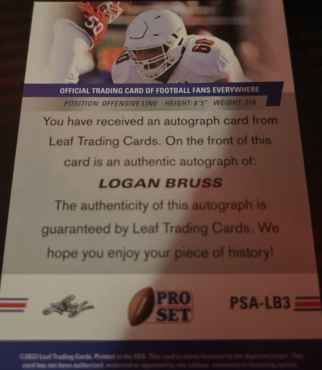 The 2022 Leaf Pro Set Draft Autographs Logan Bruss #PSA-LB3 trading card is a football autograph card featuring Logan Bruss from the National Collegiate Athletic Association (NCAA). This original card is part of the 2022 Leaf Pro Set Draft set and is authenticated by Leaf. The autograph is in the form of a label or sticker on standard card stock material, measuring 20 Pt. thickness. This rookie card is in near mint condition and is a base parallel variety in English language, manufactured in the United States.