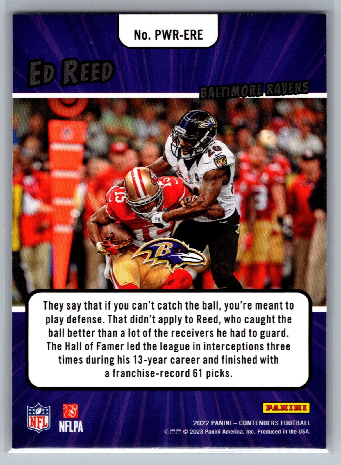 2022 Panini Contenders - Power Players #PWR-ERE Ed ReedAll cards are in Excellent condition or better. Some scans may show scratching of the penny sleeve. Please feel free to reach out for additional pictures. Thanks for looking!