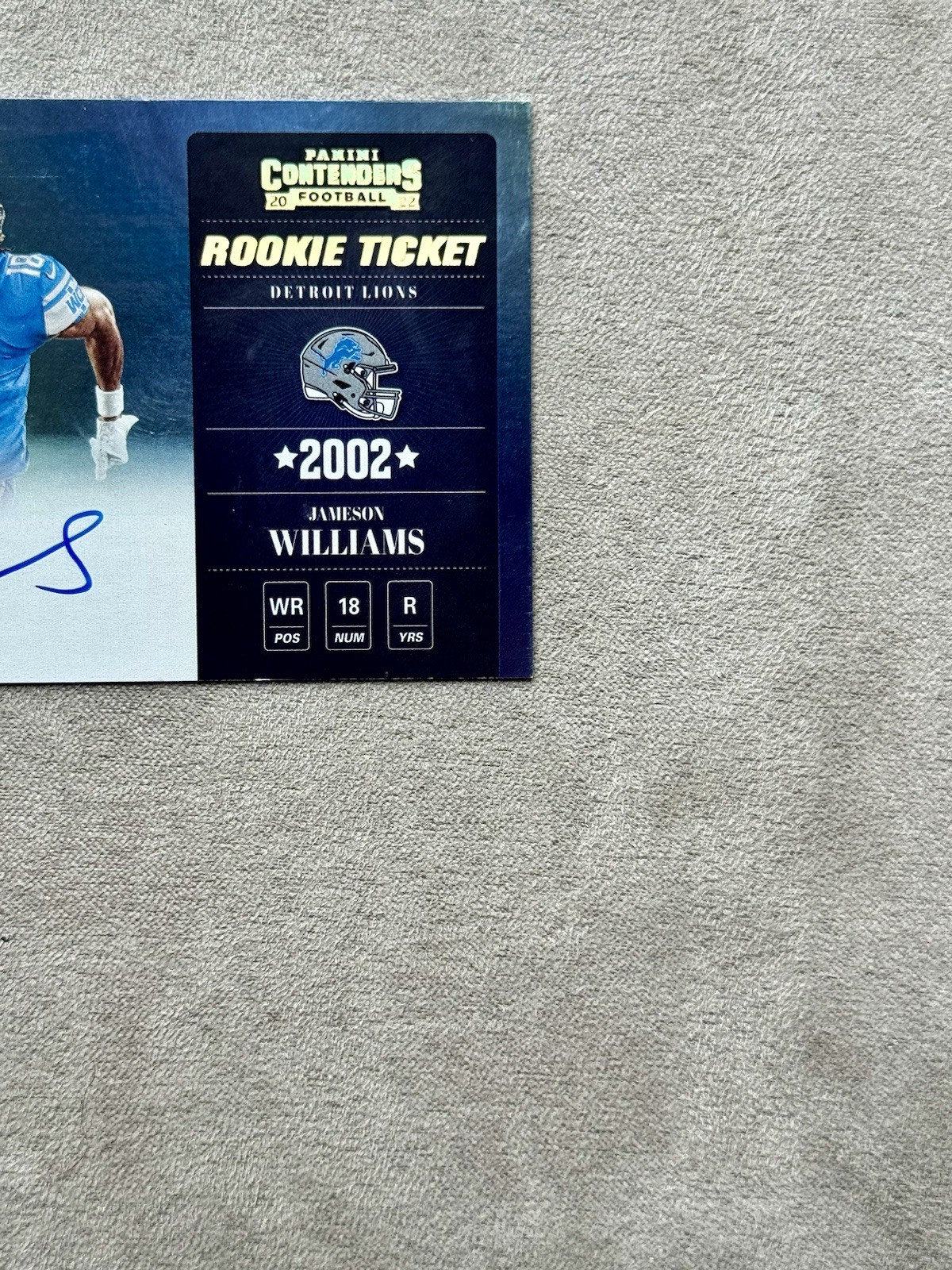 Jameson Williams Contenders Rookie Ticket Auto /10. Card looks good with minimal wear. Can send more pictures upon request. Card will ship in bubble mailer with tracking.