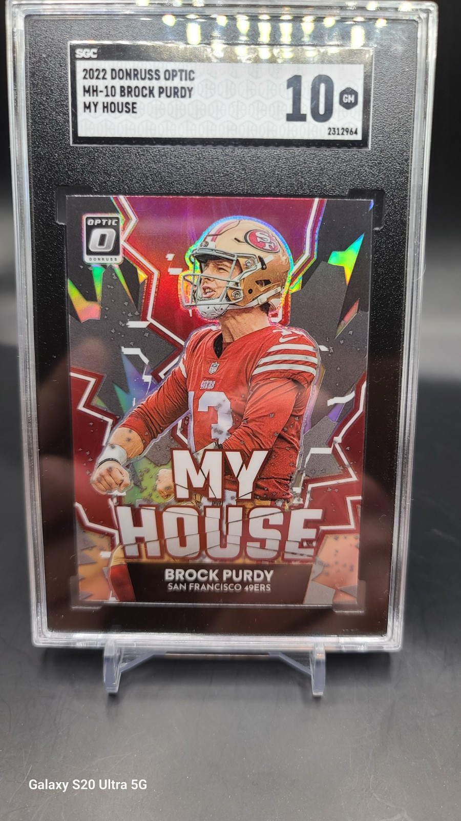 Elevate your collection with the 2022 Panini Donruss Optic Brock Purdy My House! (RC) Holo Prizm #MH-10. This sports trading card features the up-and-coming San Francisco 49ers quarterback in a stunning Holo Prizm finish, part of the highly sought-after My House! insert set. As a rookie card, it's a gem for collectors looking to capture the early career of this NFL star. Not only does it boast a sleek design and parallel variety, but this card also comes professionally graded as a perfect 10 by Sportscard Guaranty Corporation (SGC), ensuring its top-notch quality. Whether you're a die-hard 49ers fan or a connoisseur of fine sports memorabilia, this card is a remarkable piece to own from the 2022 Panini Donruss Optic series.