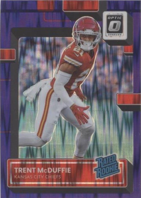 The 2022 Panini Optic Rated Rookie Trent McDuffie #247 Purple Shock Prizm trading card is a highly sought-after collectible for fans of the National Football League (NFL) and the Kansas City Chiefs. This card features the rookie player Trent McDuffie in a limited-edition Purple Shock Prizm parallel variety, making it a valuable addition to any sports trading card collection. With a near mint or better condition, this card is sure to be a prized possession for football enthusiasts and collectors alike.