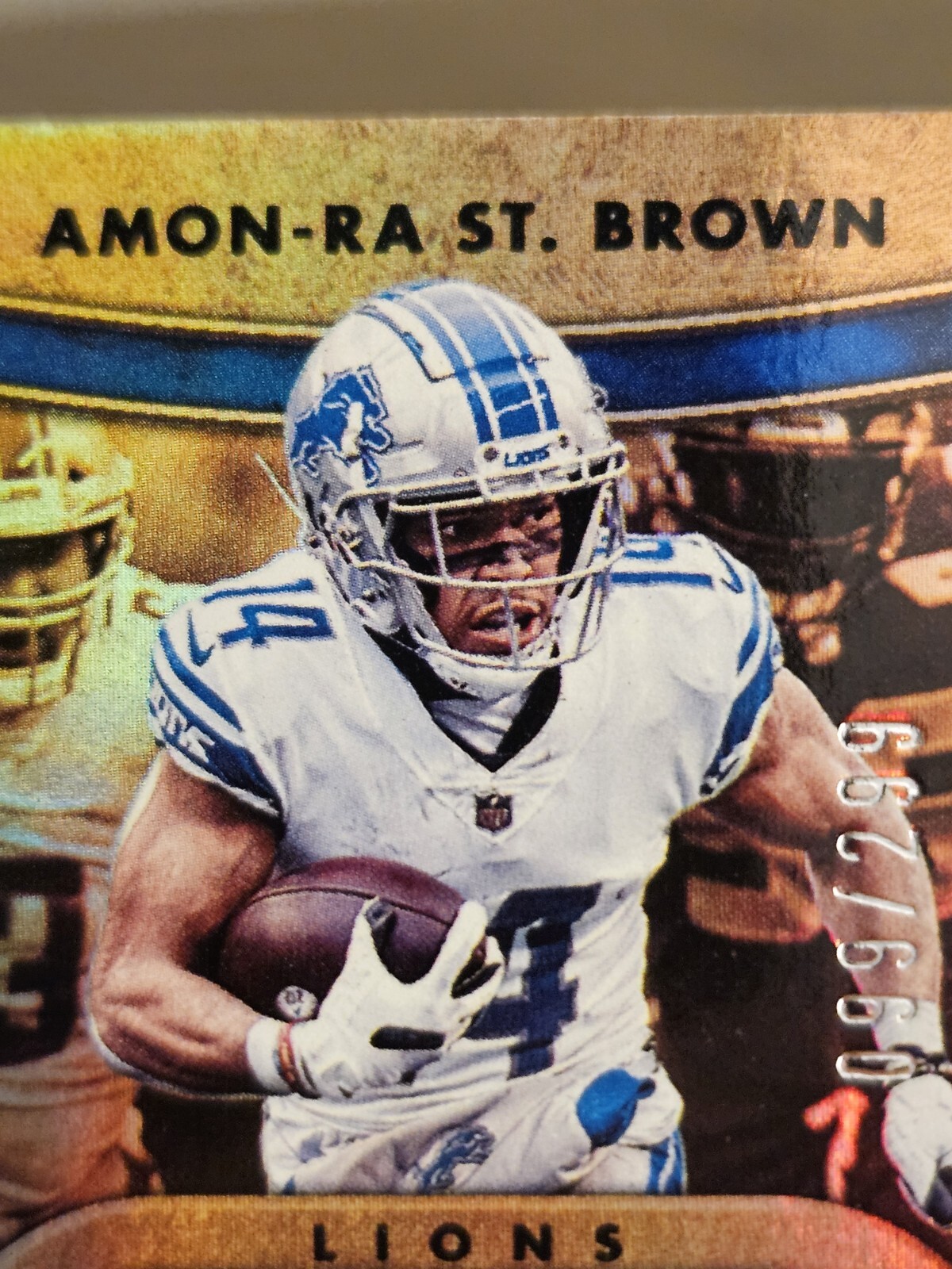 Team:Detroit Lionsbrand:PaniniSet:2022 Panini Gold StandardInsert Set:Gold GearManufacturer:PaniniPrint Run:299Series:Panini Gold StandardParallel/Variety:[Base]League:National Football League (NFL)Sport:FootballPlayer/Athlete:Amon-Ra St. BrownCard Number:GG-ASTFeatures:Insert, Memorabilia, Serial NumberedSeason:2022