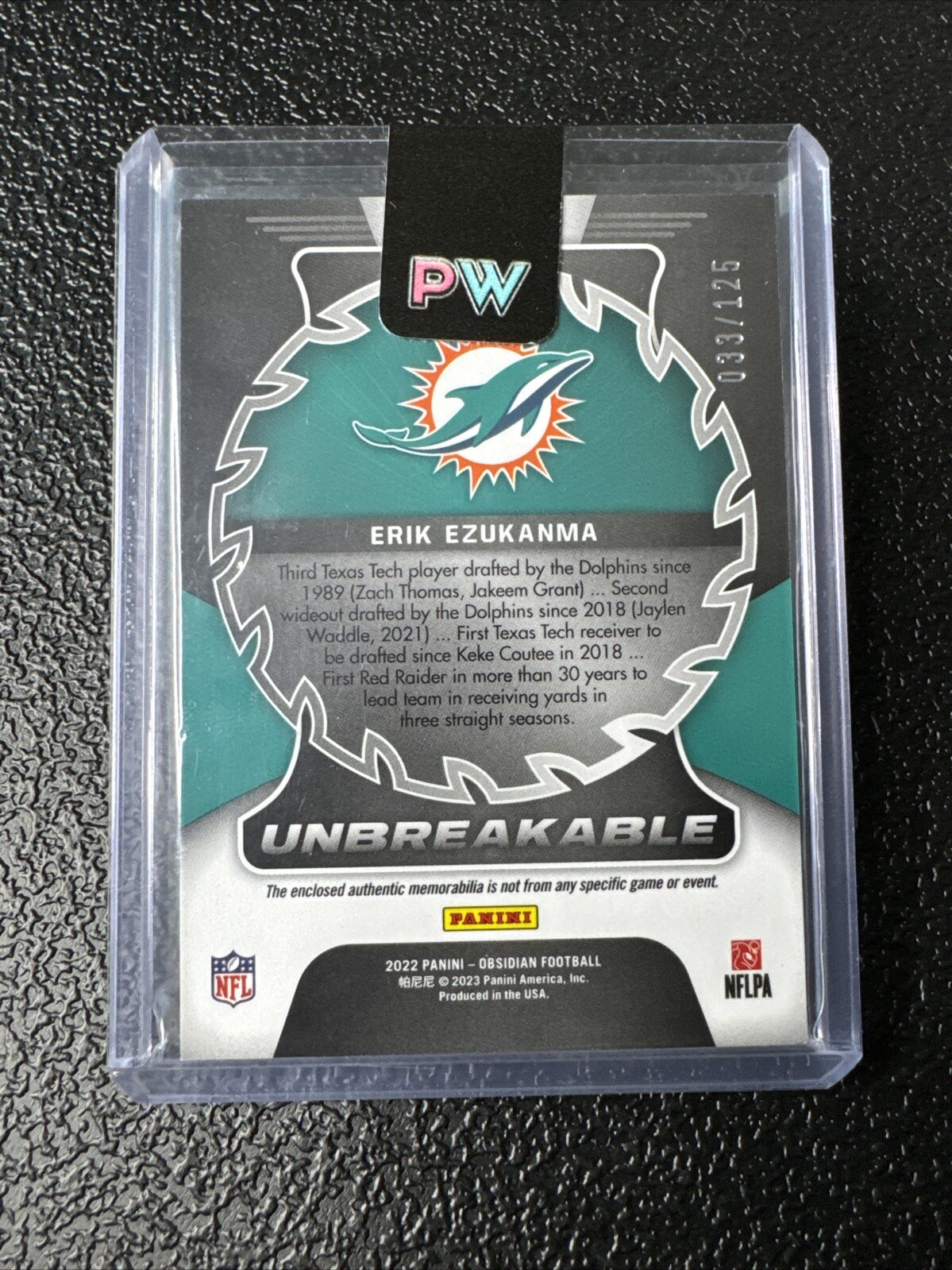 This 2022 Panini Obsidian sports trading card features Erik Ezukanma, a promising rookie from the Miami Dolphins football team. The card is made of high-quality card stock and has a print run of only 125, making it a rare find for collectors.