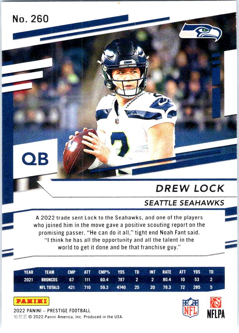This is a nice example of a 2022 Panini Prestige #260 Drew Lock . Other important information about this card: In 2022 Drew Lock played for the Seattle Seahawks. Please check out our other listings for more great cards. You will be receiving the exact card as shown in the listing and photos Please note any scratches seen in the photos are a result of the scanning process and are on the toploader not the card. Cards are in Mint/NM shape unless otherwise noted.