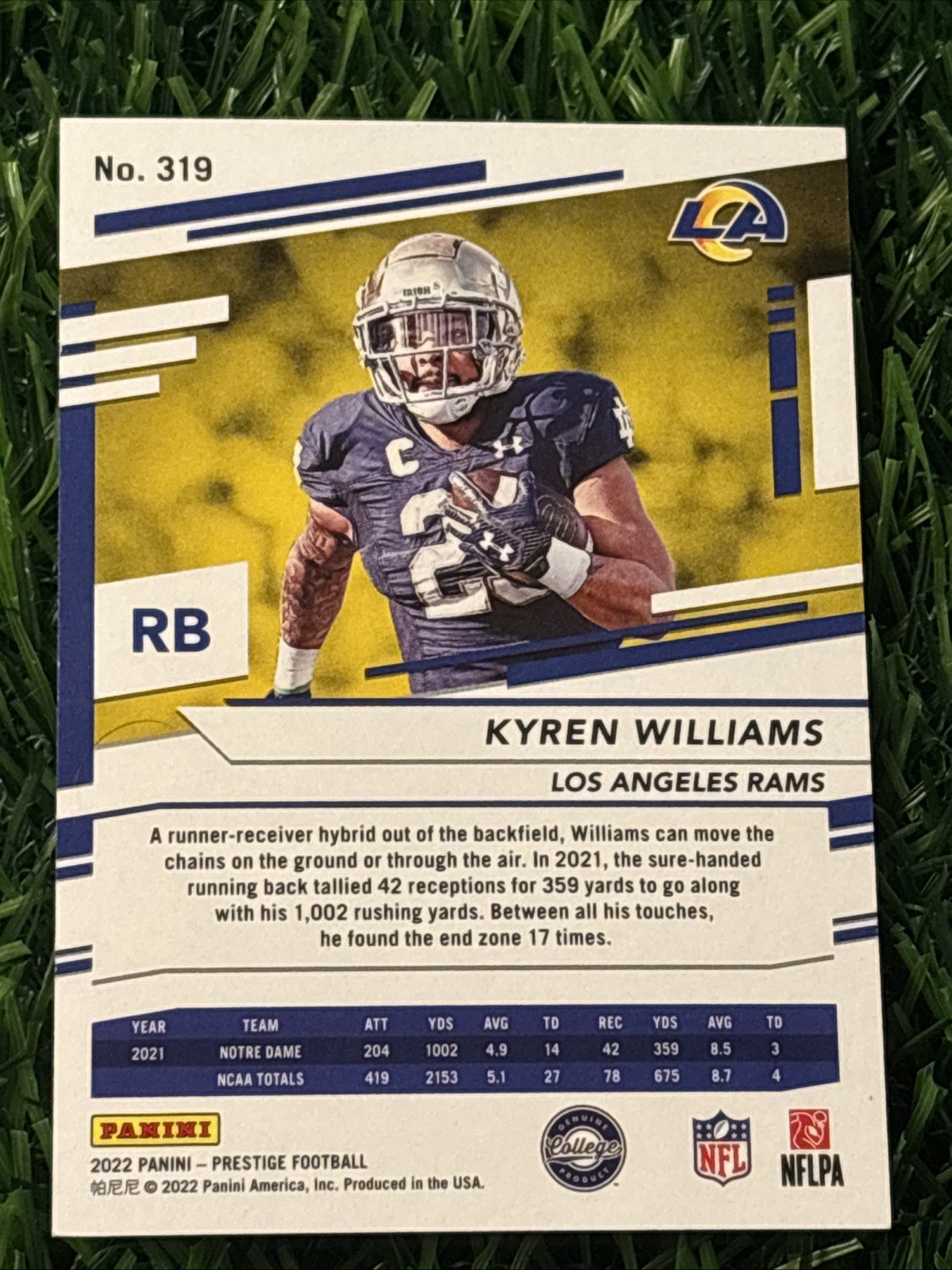 Subset:RookiesFeatures:Rookie, Serial Numbered, Base Set, Parallel/VarietyAdditional Description:Rookies - Kyren WilliamsPrint Run:299League:National Collegiate Athletic Association (NCAA), National Football League (NFL)Card Number:319Manufacturer:PaniniTeam:Los Angeles Rams, Notre Dame Fighting IrishSeason:2022Series:Panini PrestigeParallel/Variety:Xtra Points BlueSport:FootballSet:2022 Panini Prestigebrand:PaniniPlayer/Athlete:Kyren Williams