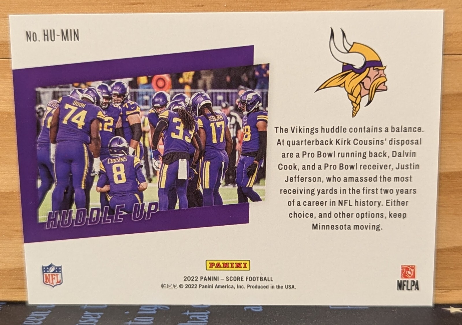 Elevate your collection with the 2023 Panini Score Huddle Up Minnesota Vikings #HU-MIA sports trading card. This card celebrates the team spirit of the Minnesota Vikings with its vibrant design and is part of the popular Huddle Up insert set. As a base set card, it holds a special place in the series and is a must-have for fans and collectors alike. Crafted by Panini, a trusted name in sports memorabilia, the card features the standard size and is printed in the United States. The card is RAW, but will ship in a penny sleeve and top loader to maintain its existing condition. Whether you're expanding your collection or gifting it to a die-hard football enthusiast, this card hits the mark.
