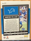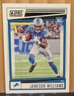 This 2022 Panini Score card features Jameson Williams, a player for the Detroit Lions. The card is a part of the base set and is considered a rookie card. It has a card number of 377 and is an original, not a licensed reprint. The card is in standard size and is a part of the National Football League (NFL) league. It is a sports trading card and is manufactured by Panini in the United States. The card is RAW, but will ship in a penny sleeve and top loader to maintain its existing condition.
