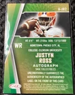 The 2022 SAGE High Series trading card features a black parallel autograph of football player Justyn Ross from the Clemson Tigers. This sports trading card is a rookie insert with the card number A-JR2, part of the 2022 collection by SAGE in collaboration with the National Collegiate Athletic Association (NCAA). The card is a valuable addition for fans and collectors of college football memorabilia.
