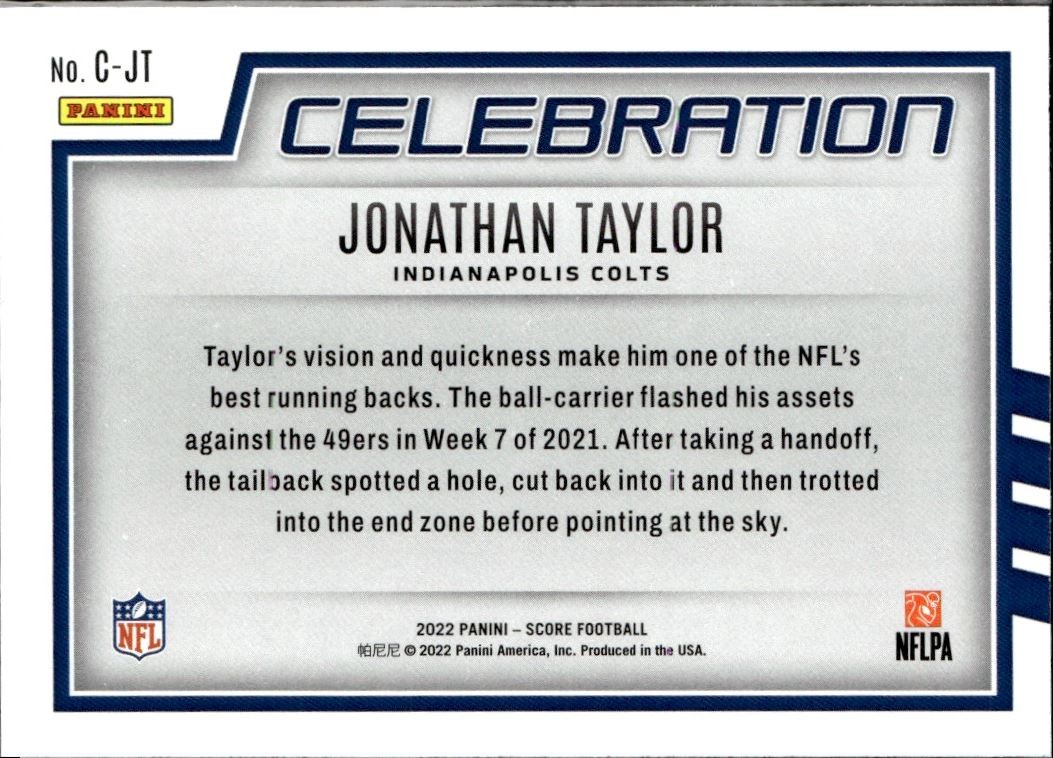 About Me Other Listings Feedback Add to Favorites Contact Me eBay Store JEm_Mint_Trading 2022 Score Celebration Jonathan Taylor Indianapolis Colts #C-JT No stock photo / These are real scans or pictures Details Description: Jonathan Taylor Category: Football Year: 2022 Product: Score Celebration Team: Indianapolis Colts Card Number: C-JT Dimensions: 3¼" x 2½" SKU: FT A0007 R01 H (7) Listing By Kronocard trading cards software v2.8.1.2