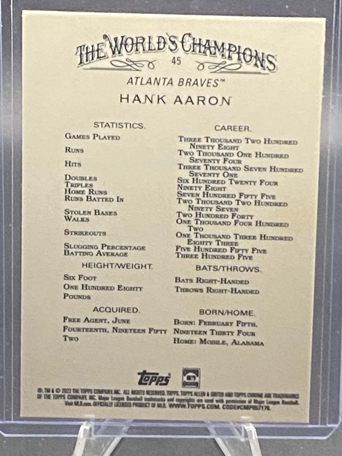 This is a nice example of a 2022 Topps Allen & Ginter Chrome #45 Hank Aaron Other important information about this card: In 2022 Hank Aaron played for the Atlanta Braves. Please check out our other listings for more great cards.