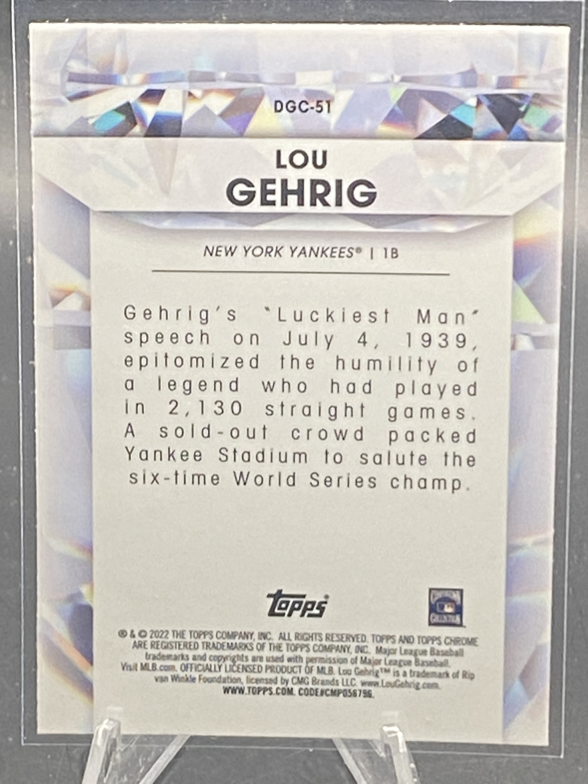 This is a nice example of a 2022 Topps Chrome Update #DGC-51 Lou Gehrig Diamond Greats Die Cuts Other important information about this card: In 2022 Lou Gehrig played for the New York Yankees. Please check out our other listings for more great cards.