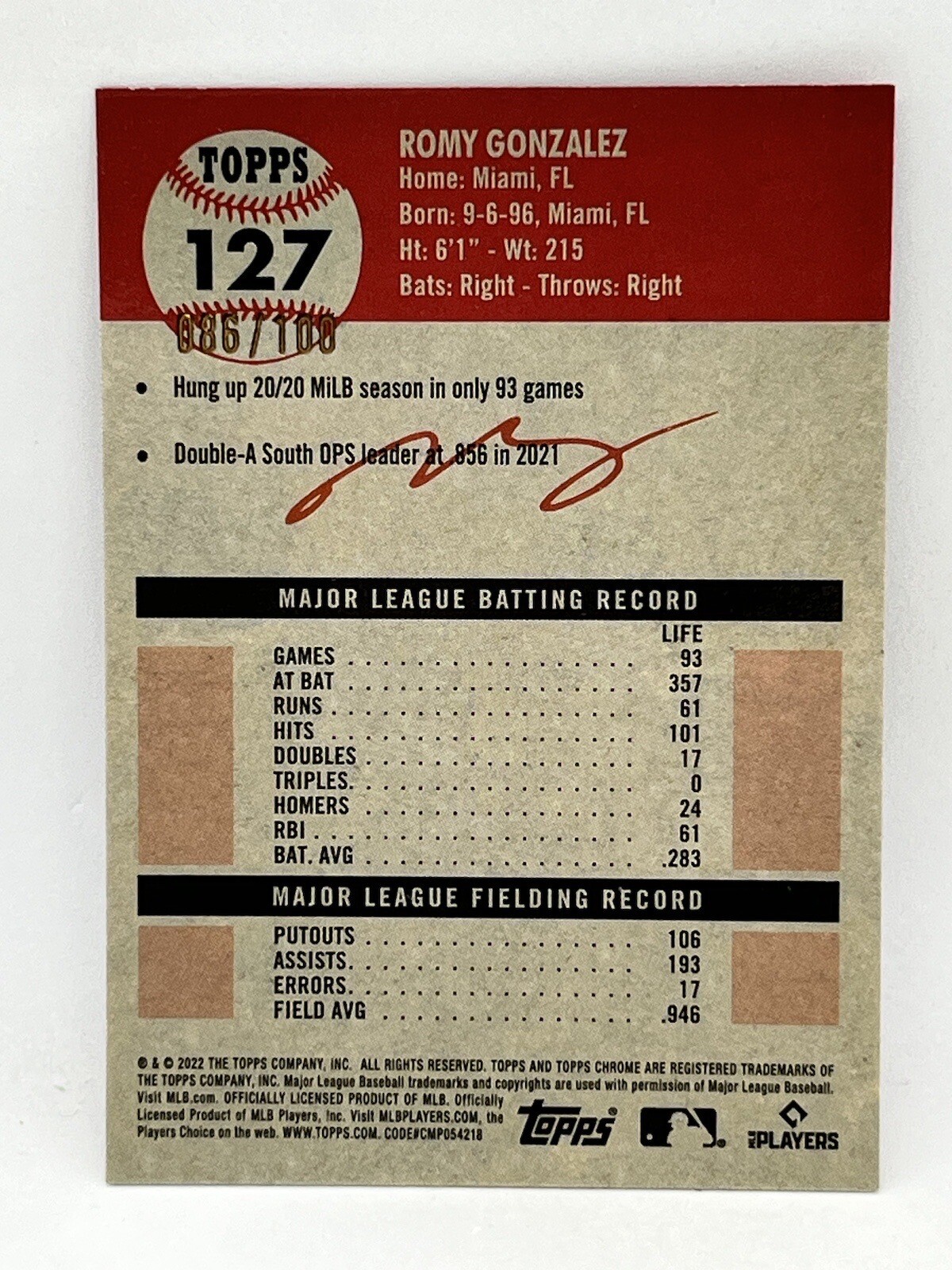 Elevate your sports card collection with the 2022 Topps Chrome Platinum Romy Gonzalez Rookie Card #127. This limited edition piece, with a print run of just 100, is a must-have for fans and collectors alike. Featuring the rising star in his Chicago White Sox gear, this card is part of the esteemed Topps Chrome set, renowned for its quality and design. This particular card stands out with its Fuschia Atomic parallel variety, providing a unique holographic sheen that catches the eye. It comes serial numbered, ensuring its exclusivity and making it a valuable addition to any MLB collection. Notable for its 'Short Print' status, this card is a true collector's edition that celebrates the talent of Romy Gonzalez and the nostalgia of the sport.