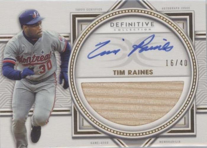The product is a 2022 Topps Definitive Collection Tim Raines Bat Relic Auto card numbered 23/40. This sports trading card features a piece of memorabilia from the Montreal Expos player, Tim Raines, and is autographed by him. The card is part of the Definitive Autographed Relic Collection insert set by Topps, a well-known manufacturer in the baseball trading card market. With its limited print run of 40 and serial numbering, this collectible is a valuable addition for fans and collectors of Major League Baseball memorabilia.