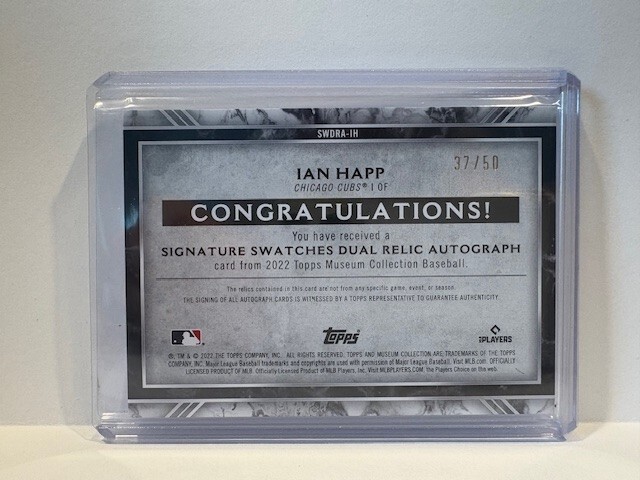 Capture a piece of baseball history with the 2022 Topps Museum Collection Swatches Dual Relic Autograph card, featuring Ian Happ of the Chicago Cubs. This exclusive card, numbered SWDRA-IH, is part of a limited print run of just 50, making it a rare addition to any collection. Its copper parallel/variety enhances the card's visual appeal, offering a unique twist to the classic memorabilia design.Not only does it include Happ's autograph, but it also boasts a swatch of game-used memorabilia, providing a tangible connection to the sport. This card is serial numbered, ensuring its authenticity and rarity. A must-have for fans and collectors alike, it represents the fusion of Ian Happ's athletic prowess with the time-honored tradition of baseball card collecting.