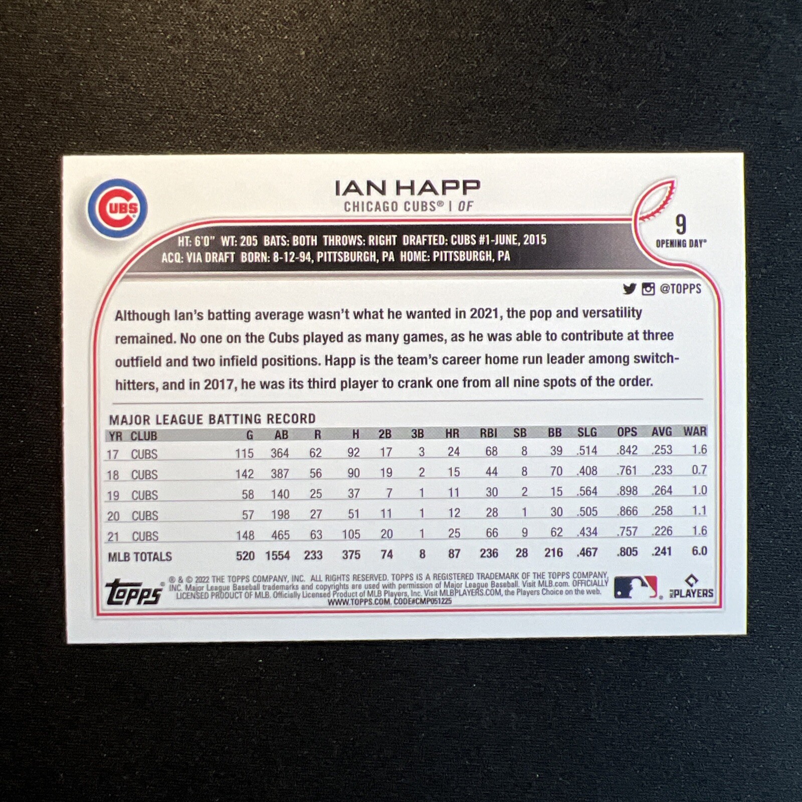 This is a 2022 Topps Opening Day sports trading card featuring Ian Happ from the Chicago Cubs. The card is made of 20 Pt. card stock material and is an original from the major league baseball (MLB) league. It is part of the base set and has a card number of 9. The card is in standard size and is not autographed or a licensed reprint. It is a great addition to any collection for fans of the Chicago Cubs or baseball in general. Get this card now and add it to your sports memorabilia collection! 💥The Card Pictured is the EXACT card that you are bidding/buying. Please review Pictures and card condition carefully. 💥 Find hundreds of categorized cards in our Ebay Store! Please visit our store and give us a follow! TONS of AMAZING deals, Store specials and daily postings! Be sure to give us a follow to receive information on our Deals, Coupons and daily listings! 🐷 Shipping All orders include tracking and insurance. Orders containing 1-6 cards are sent in a certified eBay trading card envelope. Cards are packed and sent out with upmost care as we understand the importance of preservation with being a collector. Purchased cards will be placed into a new penny sleeve prior shipping. Bonus Cards are randomly pulled at the time of packing and will not include a penny sleeve. Cards with a selling price of more than $15 will be mailed USPS Priority with tracking and insurance protection. Thank you! Please check out our eBay store and other listings! Please, feel free to reach out with any questions, and please keep an eye out for our listings that include a charity donation to the American Stroke Foundation!