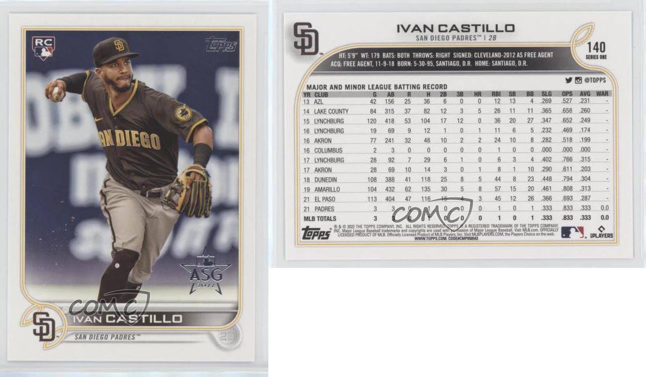 2022 Topps Series 1 - [Base] - All-Star Game Foil #140 Ivan Castillo - RC (Rookie Card) - Baseball Card - Featuring the San Diego Padres - Featuring Ivan Castillo Search for more: 2022 Topps Series 1 Search for more: 2022 Topps Series 1 - [Base] - All-Star Game Foil View all of our Listings Auctions Buy It Now About Us Located in the beautiful Pacific Northwest, COMC (Check Out My Cards) is the world's largest consignment service for trading card singles. More than 10,000 people have used our consignment service to list over 50 million trading cards. Find out how we can help you consign your items on eBay by contacting us through eBay messaging. COMC -- "The Safe & Easy Way to Buy & Sell" Representative Image - Select Specific Item above to see image of actual item Representative Image - Select Specific Item above to see image of actual item Raw Condition for Modern Cards Unless otherwise noted, raw modern cards are listed in Near Mint-Mint condition or better. A NM-MT card appears to be Mint at first glance, but upon closer inspection, may exhibit some of the following: minor print defects (e.g. roller marks, print line, dimple), minor scratches, slight edge wear, and slight corner wear. Centering is clearly visible in the images provided and does not factor into our condition assessment. Raw Condition for Vintage Cards Unless otherwise noted, raw vintage cards are listed in Excellent condition or better. An EX card may exhibit some of the following: minor rounding of corners, surface wear, print defects, light scratches, and slight edge wear/chipping. Centering is clearly visible in the images provided and does not factor into our condition assessment. Domestic Shipping Combined shipping for multiple items is available. To receive combined shipping, please ensure all desired items are in your eBay shopping cart before proceeding to checkout. eBay limits orders to 40 items per order. We automatically combine multiple orders placed on the same day. If you place multiple orders on the same day, please contact us to request a refund of applicable shipping costs. Signature confirmation may be required on invoices over $400. All cards are protected and shipped securely. International Shipping COMC offers eBay's International Shipping (EIS) for international orders under $2,500* (see country exceptions below). All duties and import fees are paid at checkout; in the rare event that there are additional import fees upon delivery, these are borne by the buyer. EIS packages route through a shipping hub in Erlanger, KY before shipping to their final destination. Please note that EIS does not allow for combined shipments. The shipping rates are determined by eBay and cannot be adjusted. *Maximum sale price exceptions: Colombia, Kuwait ($2,000); Taiwan ($1,539); Chile, Costa Rica, Guatemala, Honduras, Trinidad and Tobago ($1,000); Antigua and Barbuda, Aruba, Belize, Dominica, Grenada, Philippines, Saint Kitts and Nevis, Saint Lucia, Montserrat, Turks and Caicos Islands ($500); Dominican Republic, El Salvador ($200). Please request a shipping quote through eBay messaging for orders that exceed the maximum sale price supported by eBay's International Shipping. You will be responsible for all duties and import fees for international orders shipped outside the EIS. All cards are protected and shipped securely. Payment COMC does not accept offers on our cards through our eBay storefront. COMC utilizes eBay’s managed payments system. If you are experiencing difficulties making a payment, please contact eBay for assistance. Return Policy Returns are only accepted on the rare occasion the item is not as described. If you are making a return, please initiate the return process through eBay so a mailing label can be provided for you. Prior to listing, our expert team carefully assessed this item to represent it accurately. Please review the description and high-definition images prior to purchasing to ensure this item meets your satisfaction. We welcome you to contact us if you have further questions about this item. Trust and Integrity COMC carefully assesses each item consigned to us to prevent fraudulent items from entering the marketplace. If you believe an item offered on COMC may be fraudulent, please contact us with details so we can investigate the issue. Items we determine are outside our supported items policy may be removed. Last Modified: 6/15/2025 12:22:38 AM PDT
