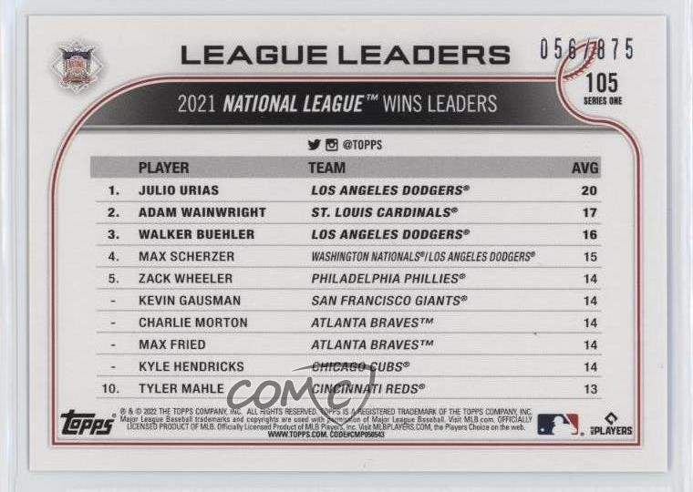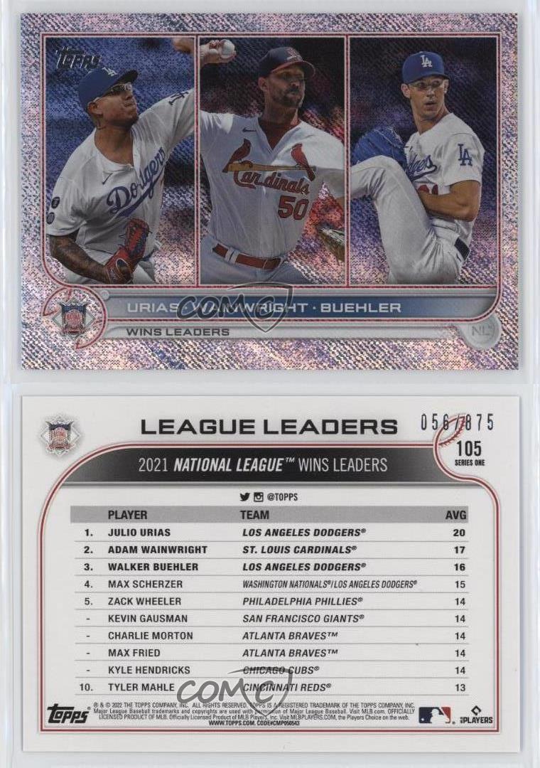2022 Topps Series 1 - [Base] - Retail Foilboard #105 League Leaders - Julio Urias, Adam Wainwright, Walker Buehler Qty Made: 875 - Baseball Card - Featuring the Los Angeles Dodgers and St. Louis Cardinals - Featuring Julio Urias , Adam Wainwright and Walker Buehler Search for more: 2022 Topps Series 1 Search for more: 2022 Topps Series 1 - [Base] - Retail Foilboard View all of our Listings Auctions Buy It Now About Us Located in the beautiful Pacific Northwest, COMC (Check Out My Cards) is the world's largest consignment service for trading card singles. More than 10,000 people have used our consignment service to list over 50 million trading cards. Find out how we can help you consign your items on eBay by contacting us through eBay messaging. COMC -- "The Safe & Easy Way to Buy & Sell" Representative Image - Select Specific Item above to see image of actual item Representative Image - Select Specific Item above to see image of actual item Raw Condition for Modern Cards Unless otherwise noted, raw modern cards are listed in Near Mint-Mint condition or better. A NM-MT card appears to be Mint at first glance, but upon closer inspection, may exhibit some of the following: minor print defects (e.g. roller marks, print line, dimple), minor scratches, slight edge wear, and slight corner wear. Centering is clearly visible in the images provided and does not factor into our condition assessment. Raw Condition for Vintage Cards Unless otherwise noted, raw vintage cards are listed in Excellent condition or better. An EX card may exhibit some of the following: minor rounding of corners, surface wear, print defects, light scratches, and slight edge wear/chipping. Centering is clearly visible in the images provided and does not factor into our condition assessment. Domestic Shipping Combined shipping for multiple items is available. To receive combined shipping, please ensure all desired items are in your eBay shopping cart before proceeding to checkout. eBay limits orders to 40 items per order. We automatically combine multiple orders placed on the same day. If you place multiple orders on the same day, please contact us to request a refund of applicable shipping costs. Signature confirmation may be required on invoices over $400. All cards are protected and shipped securely. International Shipping COMC offers eBay's International Shipping (EIS) for international orders under $2,500* (see country exceptions below). All duties and import fees are paid at checkout; in the rare event that there are additional import fees upon delivery, these are borne by the buyer. EIS packages route through a shipping hub in Erlanger, KY before shipping to their final destination. Please note that EIS does not allow for combined shipments. The shipping rates are determined by eBay and cannot be adjusted. *Maximum sale price exceptions: Colombia, Kuwait ($2,000); Taiwan ($1,539); Chile, Costa Rica, Guatemala, Honduras, Trinidad and Tobago ($1,000); Antigua and Barbuda, Aruba, Belize, Dominica, Grenada, Philippines, Saint Kitts and Nevis, Saint Lucia, Montserrat, Turks and Caicos Islands ($500); Dominican Republic, El Salvador ($200). Please request a shipping quote through eBay messaging for orders that exceed the maximum sale price supported by eBay's International Shipping. You will be responsible for all duties and import fees for international orders shipped outside the EIS. All cards are protected and shipped securely. Payment COMC does not accept offers on our cards through our eBay storefront. COMC utilizes eBay’s managed payments system. If you are experiencing difficulties making a payment, please contact eBay for assistance. Return Policy Returns are only accepted on the rare occasion the item is not as described. If you are making a return, please initiate the return process through eBay so a mailing label can be provided for you. Prior to listing, our expert team carefully assessed this item to represent it accurately. Please review the description and high-definition images prior to purchasing to ensure this item meets your satisfaction. We welcome you to contact us if you have further questions about this item. Trust and Integrity COMC carefully assesses each item consigned to us to prevent fraudulent items from entering the marketplace. If you believe an item offered on COMC may be fraudulent, please contact us with details so we can investigate the issue. Items we determine are outside our supported items policy may be removed. Last Modified: 6/12/2025 12:47:57 PM PDT