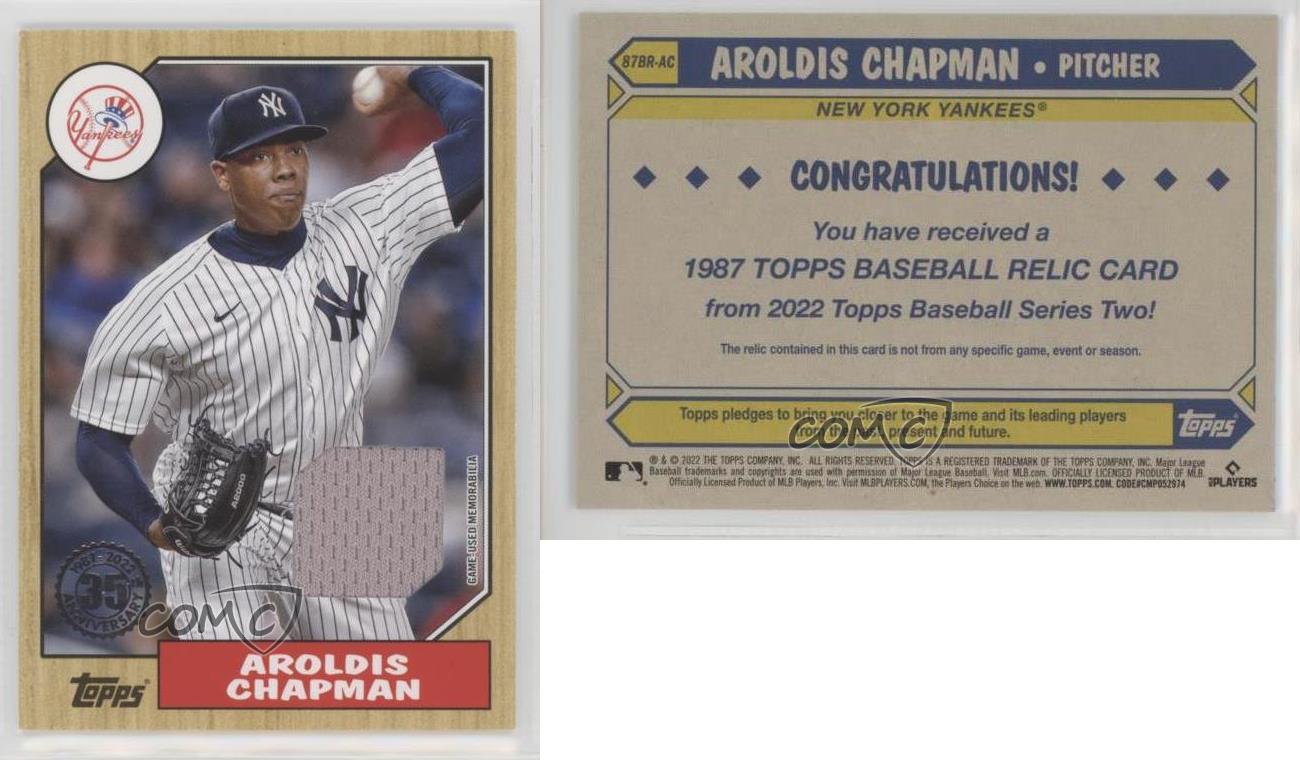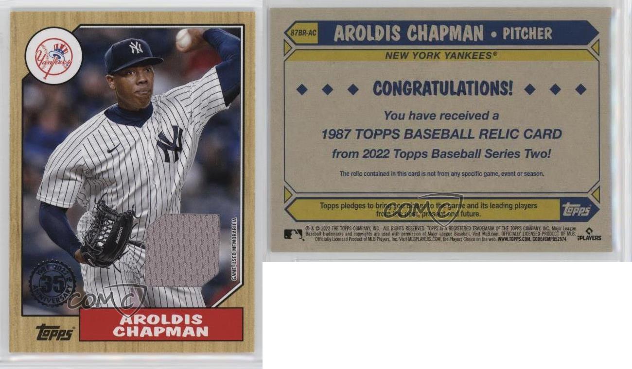 Love this throwback design! The relic piece is a cool touch, and as a Yankees fan, having a Chapman card in the iconic '87 Topps style is awesome. The card arrived in great condition, and the vintage vibe makes it stand out in my collection. Definitely a must-have for any baseball card enthusiast or Yankees memorabilia collector.