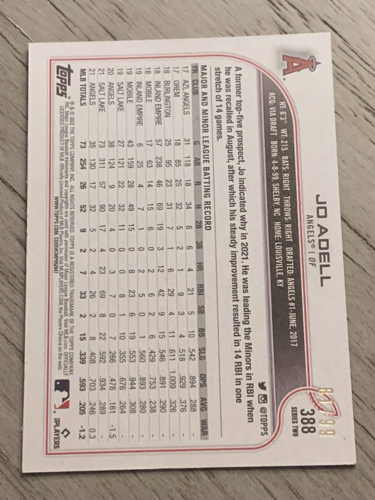 Delve into the world of baseball collectibles with the 2022 Topps Series 2 Future Stars card featuring Jo Adell of the Anaheim Angels. This Vintage Stock Parallel card, numbered #388, is a must-have for enthusiasts and fans alike, with its limited print run of just 99 copies making it a coveted piece for your collection. Crafted from quality card stock and paperboard, this original card is presented in English and hails from the United States. As part of the esteemed 2022 Topps set, this card captures the essence of the sport and the promise of a rising star in Major League Baseball, without the presence of an autograph, maintaining its classic appeal.