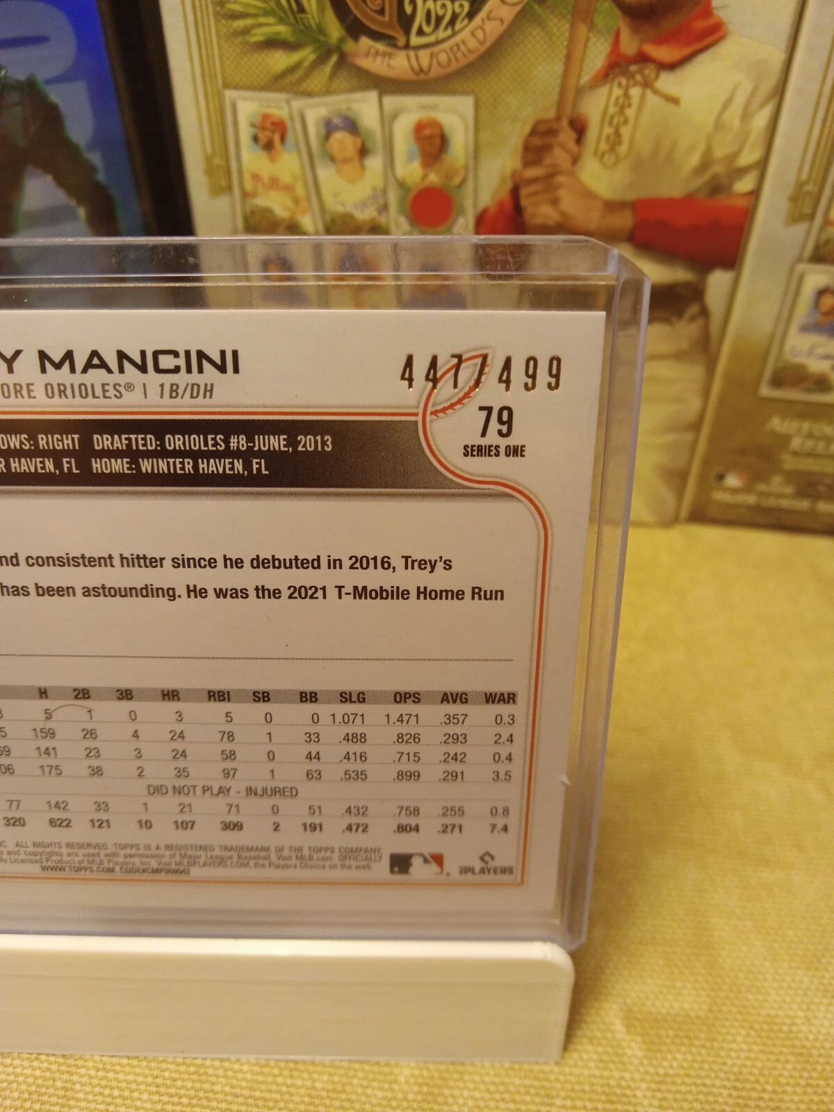 This 2022 Topps Series 1 trading card features Trey Mancini of the Baltimore Orioles. The card is a green foil parallel with a serial number of 447/499. It is an original, ungraded card in near mint or better condition and part of the Major League (MLB) league. The card is perfect for any sports trading card collector looking to add to their collection.