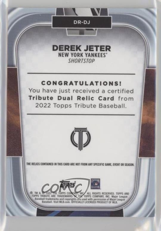 The 2025 Topps Tribute Derek Jeter Dual Game-used Relic Green trading card is a highly collectible item for fans of Major League Baseball, specifically the New York Yankees. Limited to a print run of only 99 cards, this dual relic card features a piece of game-used memorabilia from Derek Jeter. As part of the Topps Tribute set, this card is serial numbered, making it a rare and valuable addition to any sports trading card collection. The green parallel adds a unique touch to this coveted item for baseball enthusiasts.