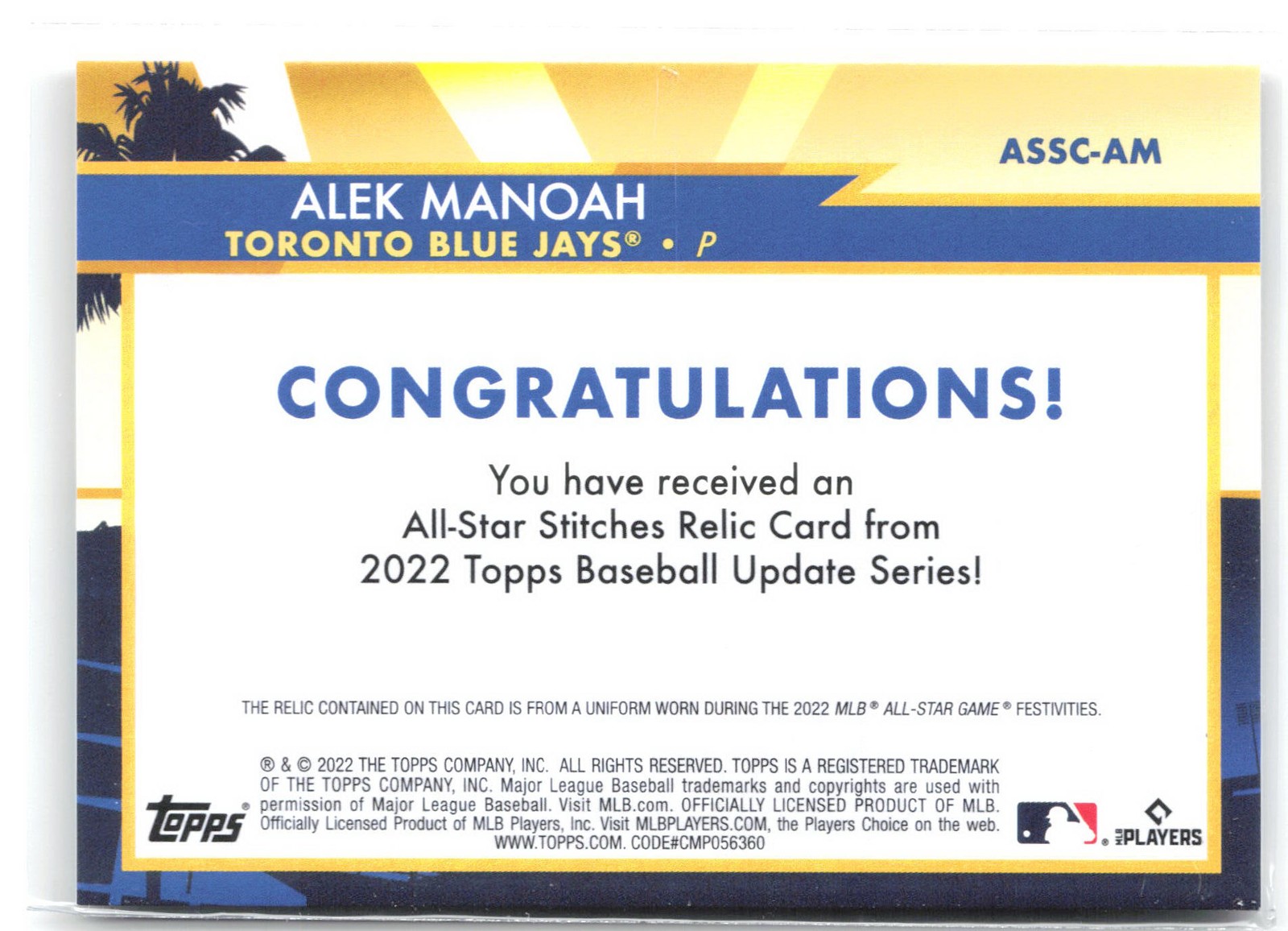 Welcome to CoastalCards757 Alek Manoah Topps 2022 #ASSC-AM MEM You are Bidding on the card shown above. Condition as is. Please feel free to message with any questions or concerns. We will ship PWE with request of buyer at $1 on any items selling below $20 If you win multiple items we will always combine shipping and provide tracking. CoastalCards757