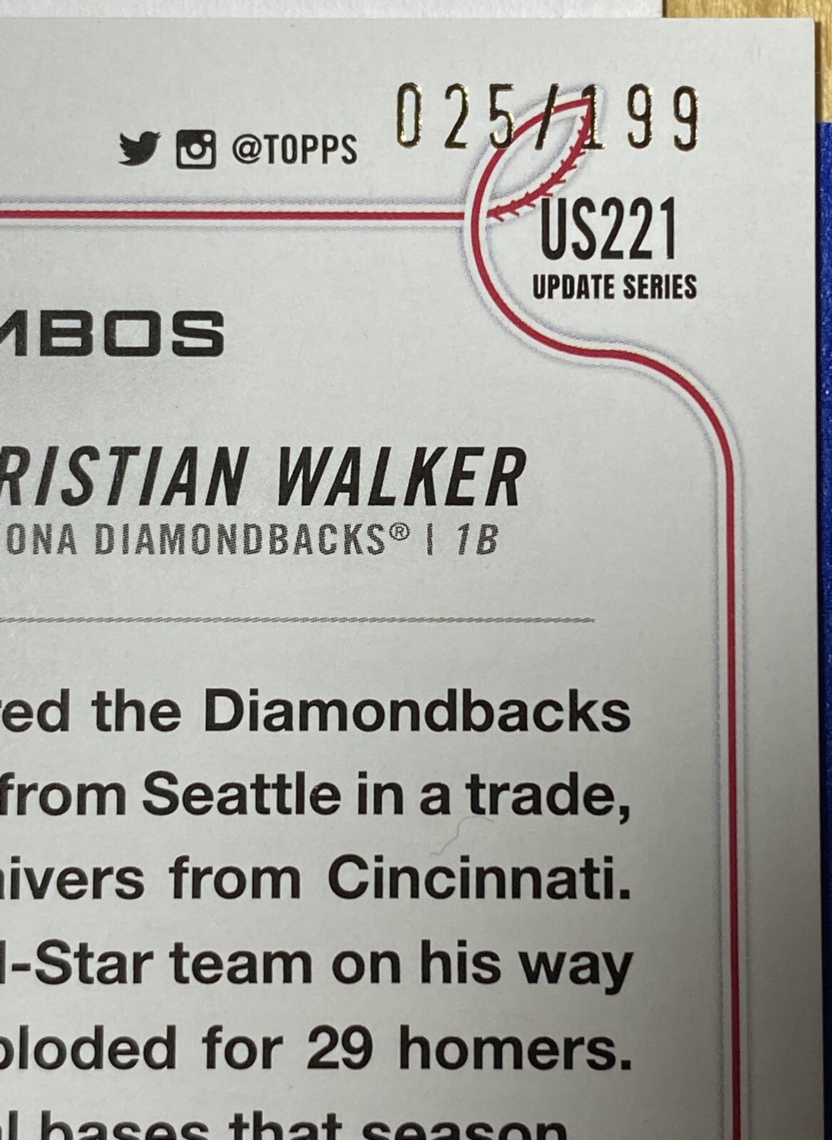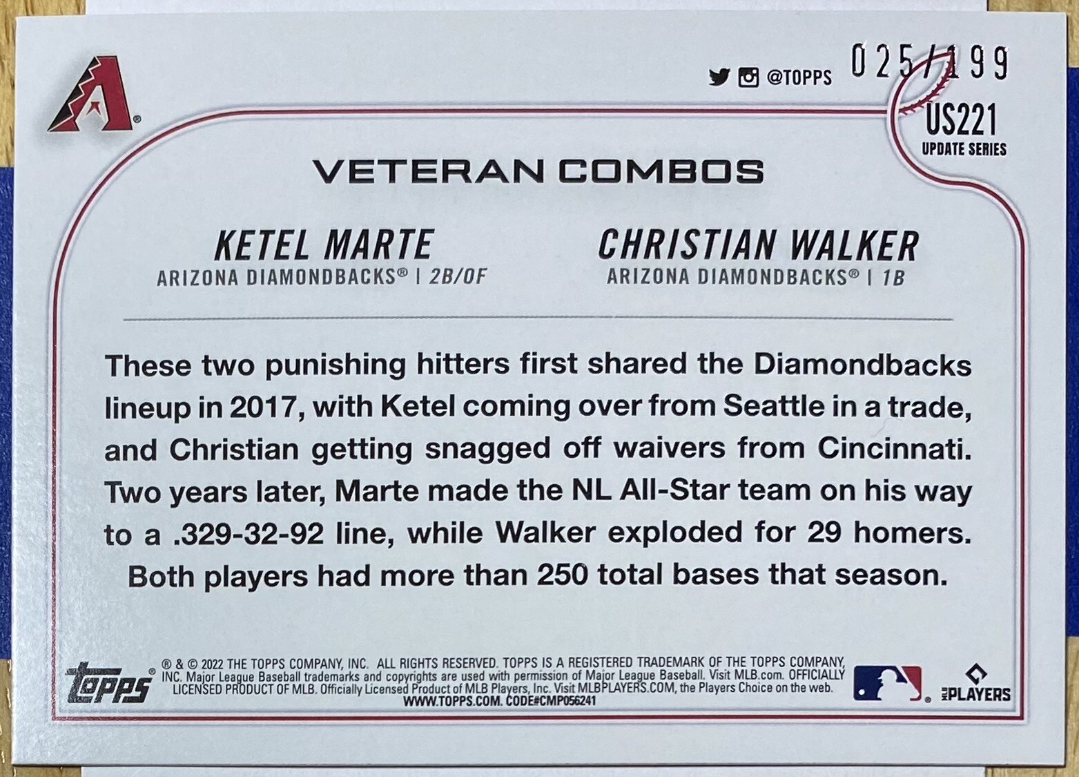 2022 Topps Update Desert Cool Off Ketel Marte/Christian Walker US221 Parallel Red Foil Short Print /199 Arizona Diamondbacks. ***PLEASE READ CAREFULLY*** PLEASE CAREFULLY INSPECT ALL POSTED PICTURES FOR ANY NOTICEABLE ISSUES! CARDS THAT ARE $20 AND UNDER ARE SHIPPED FREE WITH ESE (EBAY STANDARD ENVELOPE) PROGRAM AND ARE SHIPPED IN A PWE (PLAIN WHITE ENVELOPE) TRACKING INFORMATION MAY HAVE A LIMITED AMOUNT OF UPDATES. CARDS THAT ARE OVER $20 WILL BE SHIPPED WITH USPS GROUND ADVANTAGE IN A BUBBLE MAILER WITH TRACKING. THICK CARDS UNDER $20 WILL BE SHIPPED IN A BUBBLE MAILER WITH USPS GROUND ADVANTAGE FOR A FLAT RATE OF $3.75. CARDS ARE SHIPPED IN A TOP LOADER OR A SEMI-RIGID CARD HOLDER LIKE A CARD SAVER 1 OR ULTRA PRO. THE POSTAL SERVICE (ESTIMATED) DELIVERY TIME FOR ESE (EBAY STANDARD ENVELOPE) IS 3-6 (BUSINESS) DAYS ON (AVERAGE). HOWEVER HOLIDAYS AND OTHER ISSUES WITH USPS MAY CAUSE LONGER DELIVERY TIMES WITH YOUR SHIPMENT. TRACKING INFORMATION CAN SOMETIMES RUN A DAY OR TWO BEHIND. FOR EXAMPLE IF TRACKING SHOWS “OUT FOR DELIVERY” BUT YOU DON’T RECEIVE IT THAT DAY THEN YOU WILL USUALLY RECEIVE IT WITHIN 1-2 (BUSINESS) DAYS FROM THAT DATE. PLEASE BE PATIENT IN THESE CIRCUMSTANCES. APPROXIMATELY 95% OF ALL CARDS ARE IN NEAR MINT OR BETTER CONDITION WHILE ABOUT 5% ARE IN EXCELLENT-NEAR MINT CONDITION. PLEASE BE ADVISED THAT A SMALL NUMBER OF CHROME CARDS SUCH AS PRIZM, OPTIC, MOSAIC, SELECT, BOWMAN, TOPPS CHROME AND OTHER CHROME PRODUCTS MAY HAVE FACTORY ISSUES SUCH AS PRINT LINES OR OTHER SURFACE IMPERFECTIONS. IF YOU WOULD LIKE TO KNOW THE SPECIFIC DETAILED CONDITION OF A CARD YOU ARE INTERESTED IN THEN PLEASE SEND ME A MESSAGE THROUGH EBAY’S MESSAGING SYSTEM. CARDS ARE SHIPPED NEXT DAY MONDAY-FRIDAY. IN SOME CASES CARDS MAY BE SHIPPED THE SAME DAY! PLEASE, FEEL FREE TO SEND AN OFFER. ALL OFFERS WILL BE CONSIDERED! ***NEW CARDS ADDED WEEKLY*** CHECK BACK FOR STORE WIDE SALES! PLEASE CONSIDER ADDING ME TO YOUR SAVED SELLER’S LIST! IF YOU HAVE ANY QUESTIONS OR CONCERNS ABOUT A SHIPMENT OR A LISTING PLEASE CONTACT ME THROUGH EBAY’S MESSAGING SYSTEM.