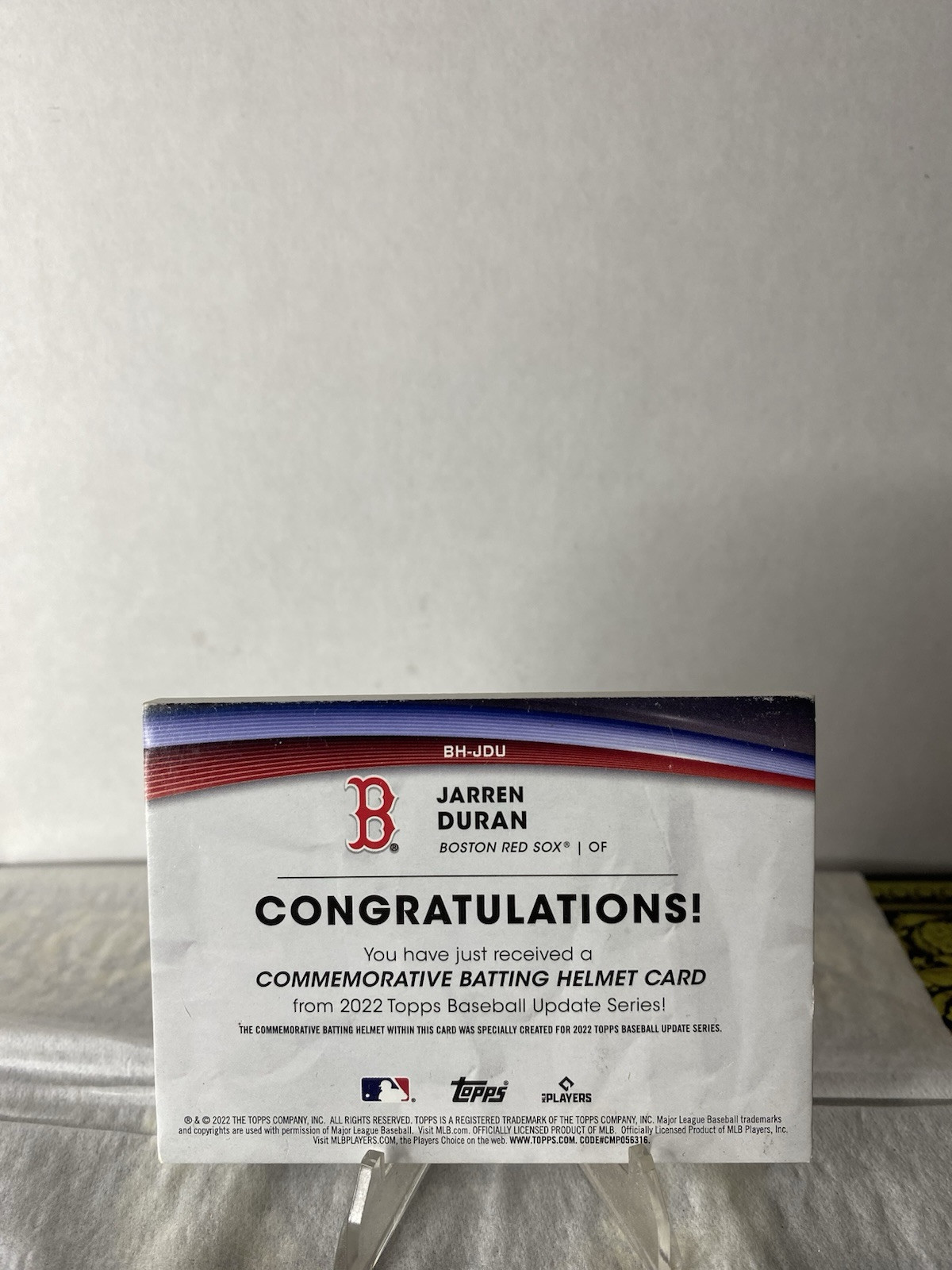 The product is a 2022 Topps Update trading card featuring Boston Red Sox player Jarren Duran. This Rookie Card includes a Commemorative Batting Helmet Relic, making it a special collectible item. The card number is BH-JDU, and it is an original release by Topps for the MLB season of 2022.