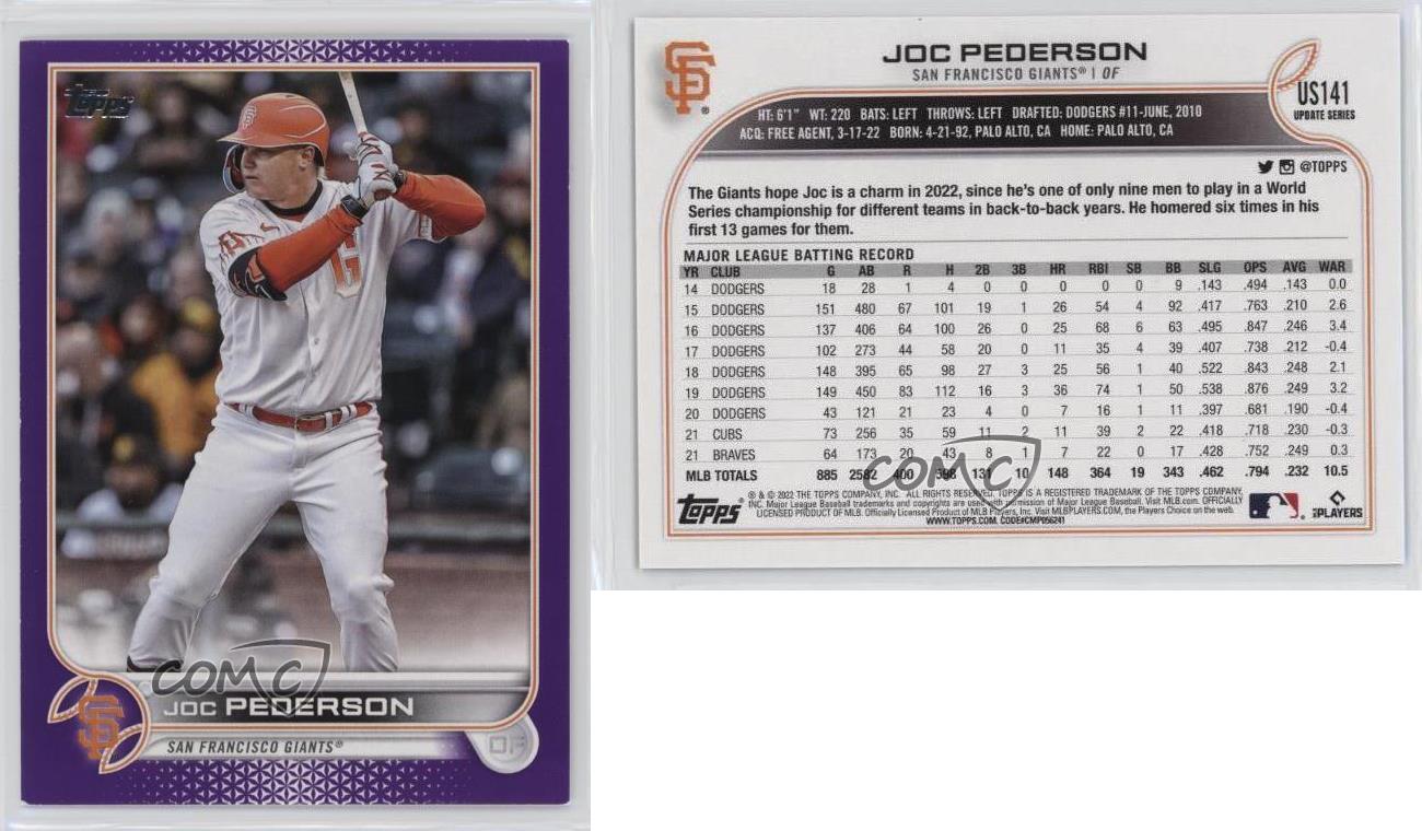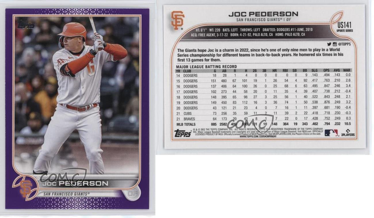 2022 Topps Update Series - [Base] - Meijer Purple #US141 Joc Pederson - Baseball Card - Featuring the San Francisco Giants - Featuring Joc Pederson Search for more: 2022 Topps Update Series Search for more: 2022 Topps Update Series - [Base] - Meijer Purple View all of our Listings Auctions Buy It Now About Us Located in the beautiful Pacific Northwest, COMC (Check Out My Cards) is the world's largest consignment service for trading card singles. More than 10,000 people have used our consignment service to list over 50 million trading cards. Find out how we can help you consign your items on eBay by contacting us through eBay messaging. COMC -- "The Safe & Easy Way to Buy & Sell" Representative Image - Select Specific Item above to see image of actual item Representative Image - Select Specific Item above to see image of actual item Raw Condition for Modern Cards Unless otherwise noted, raw modern cards are listed in Near Mint-Mint condition or better. A NM-MT card appears to be Mint at first glance, but upon closer inspection, may exhibit some of the following: minor print defects (e.g. roller marks, print line, dimple), minor scratches, slight edge wear, and slight corner wear. Centering is clearly visible in the images provided and does not factor into our condition assessment. Raw Condition for Vintage Cards Unless otherwise noted, raw vintage cards are listed in Excellent condition or better. An EX card may exhibit some of the following: minor rounding of corners, surface wear, print defects, light scratches, and slight edge wear/chipping. Centering is clearly visible in the images provided and does not factor into our condition assessment. Domestic Shipping Combined shipping for multiple items is available. To receive combined shipping, please ensure all desired items are in your eBay shopping cart before proceeding to checkout. eBay limits orders to 40 items per order. We automatically combine multiple orders placed on the same day. If you place multiple orders on the same day, please contact us to request a refund of applicable shipping costs. Signature confirmation may be required on invoices over $400. All cards are protected and shipped securely. International Shipping COMC offers eBay's International Shipping (EIS) for international orders under $2,500* (see country exceptions below). All duties and import fees are paid at checkout; in the rare event that there are additional import fees upon delivery, these are borne by the buyer. EIS packages route through a shipping hub in Erlanger, KY before shipping to their final destination. Please note that EIS does not allow for combined shipments. The shipping rates are determined by eBay and cannot be adjusted. *Maximum sale price exceptions: Colombia, Kuwait ($2,000); Taiwan ($1,539); Chile, Costa Rica, Guatemala, Honduras, Trinidad and Tobago ($1,000); Antigua and Barbuda, Aruba, Belize, Dominica, Grenada, Philippines, Saint Kitts and Nevis, Saint Lucia, Montserrat, Turks and Caicos Islands ($500); Dominican Republic, El Salvador ($200). Please request a shipping quote through eBay messaging for orders that exceed the maximum sale price supported by eBay's International Shipping. You will be responsible for all duties and import fees for international orders shipped outside the EIS. All cards are protected and shipped securely. Payment COMC does not accept offers on our cards through our eBay storefront. COMC utilizes eBay’s managed payments system. If you are experiencing difficulties making a payment, please contact eBay for assistance. Return Policy Returns are only accepted on the rare occasion the item is not as described. If you are making a return, please initiate the return process through eBay so a mailing label can be provided for you. Prior to listing, our expert team carefully assessed this item to represent it accurately. Please review the description and high-definition images prior to purchasing to ensure this item meets your satisfaction. We welcome you to contact us if you have further questions about this item. Trust and Integrity COMC carefully assesses each item consigned to us to prevent fraudulent items from entering the marketplace. If you believe an item offered on COMC may be fraudulent, please contact us with details so we can investigate the issue. Items we determine are outside our supported items policy may be removed. Last Modified: 6/25/2025 2:21:47 PM PDT