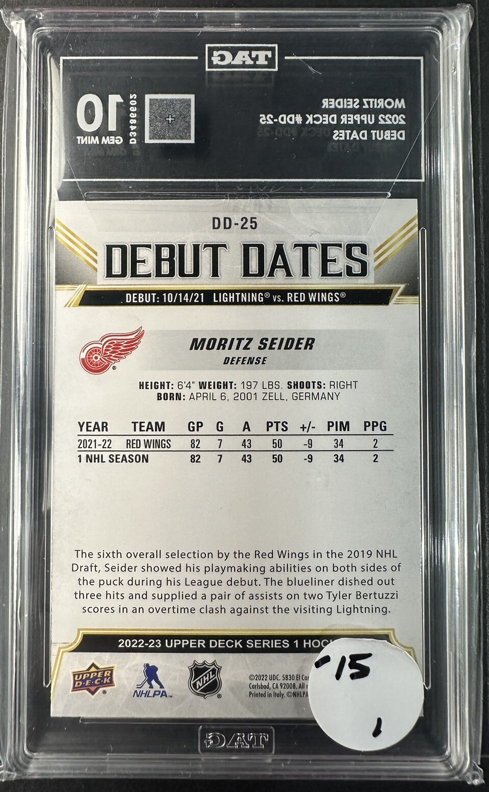 This 2022 Upper Deck Moritz Seider Honor Roll card is a must-have for Detroit Red Wings fans and collectors alike. The card features a stunning Gold Rainbow parallel design and is graded GEM MINT TAG 10 by Technical Authentication & Grading (TAG). This rookie card showcases Seider in his debut season and is from the 2021-22 Upper Deck set. Measuring at a standard size of 35 Pt., this English language card is an original and authentic Upper Deck product, with card number HR-51. Don't miss out on the opportunity to add this impressive card to your collection.