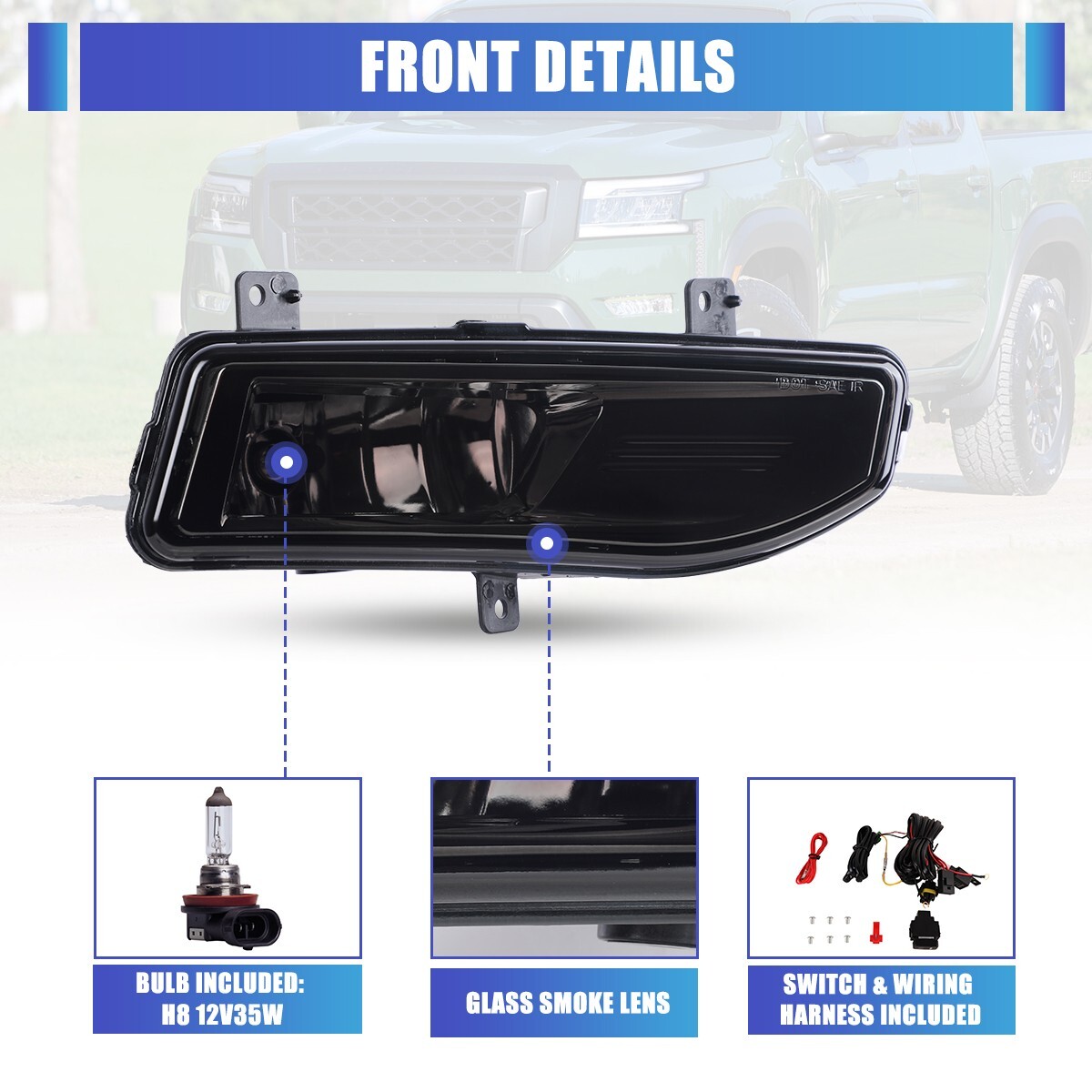 Head Lights Tail Lights Fog Lights Turn Signal Bumper Fender Flare Inner Fender Hubcaps Refrigerator Other Items for sale Head Lights Tail Lights Fog Lights Turn Signal Bumper Fender Flare Inner Fender Liners Portable Refrigerator Smoke Fog Lights For 2022-2025 Nissan Frontier Driving Bumper Lamps w/ Wiring Product Description 💜💜 Features ✧ Durable Material for long lifespan ✧ Waterproof Sealing for moisture prevented ✧ Easy Installation for Plug and Play ✧ DOT/SAE Compliance for street legal 💜💜Specification Bulb Type: H8 12V35W Certification: DOT/SAE compliance Switch and Wiring Harness: Included Color Finish: Clear Lens Replaces Original (OE) Part #:L: 26155-8995B; R: 26150-8995B Partslink Number: L: NI2592139; R: NI2593139 💜💜Vehicle Fitment Compatible for 2022 Nissan Frontier Compatible for 2023 Nissan Frontier Compatible for 2024 Nissan Frontier Compatible for 2025 Nissan Frontier Fit S and SV Models ONLY; Did Not Fit PRO-X, PRO-4X, MIDNIGHT EDITION and Long Bed SV. 💜💜Package include 1. A pair of fog lights (left and right side) 2. A pair of H8 bulbs (in the fog lights) 3. Switch and Wiring Harness 💜💜Note * Please make sure this is the right size/product for your vehicles year, make, and model before purchasing it. * The change of light bulb may cause water vapor, which due to the bulb is not fit the lamp body well. The usage of our halogen bulbs (come with fog lights) is highly recommended. * Installation Instruction is NOT Included. Payment Shipping Return About us Contact us Payment Appreciated for the prompt payment, Contact us if bid by mistake, system open unpaid item automatically. Payment must be complete within 3 days from the date you purchase or after the end of auction. Items unpaid within 3 days of the auction end will be forfeited. We reserve the right of cancel the order and re-selling the items. Shipping All shipment will ship by UPS or USPS . All items will be ship within 1 working days , and we will ship out all orders as soon as possible after payment verified, please allow up to 1-4 business days for delivery. CANADA & International customers please note: your government might charge a duty tax (brokerage fees). We do not responsible for any custom duty or import tax. Why Choose the US Stock? 1. Us Local Shipping, No Extra Customs Cost to the US. 2. Fast Delivery: 1-4 Working days Delivery. 3. Best After-Sales Service!!! Return The buyer is responsible for all return shipping including a result of customer error or defective item. 1) If you received an incorrect, damaged, defective, or item not as described, contact us for full refund or replacement on our cost. 2) If you want to return the item, please contact us within 60 days after package received. Return products must also be in its original condition: including box, packaging and all other accessories. About us We are the best auto parts, we have been pursuing excellence, continuous exploration as the slogan, let customer satisfaction is our purpose! We adhere to the United States local delivery, one year warranty! Welcome! Contact us How Should You Contact us? Please Read The Item Description And See if The item Fits Your Vehicle Exactly. If You Found Any questions, Feel Free to email us by "Ask a question" Our Office Hours Are Monday - Friday 8:00am - 5:00pm PST / 11:00am - 8:000pm ET, We Do Not Answer Any E-Mails On Weekend, And We Will Reply All E-Mails In The Order It Was Receive. All E-Mail Take Us Around 24 Hours To Respond To Any E-Mail. We Are Close During The Weekends And We Do Not Answer Any E-Mails During That Time.