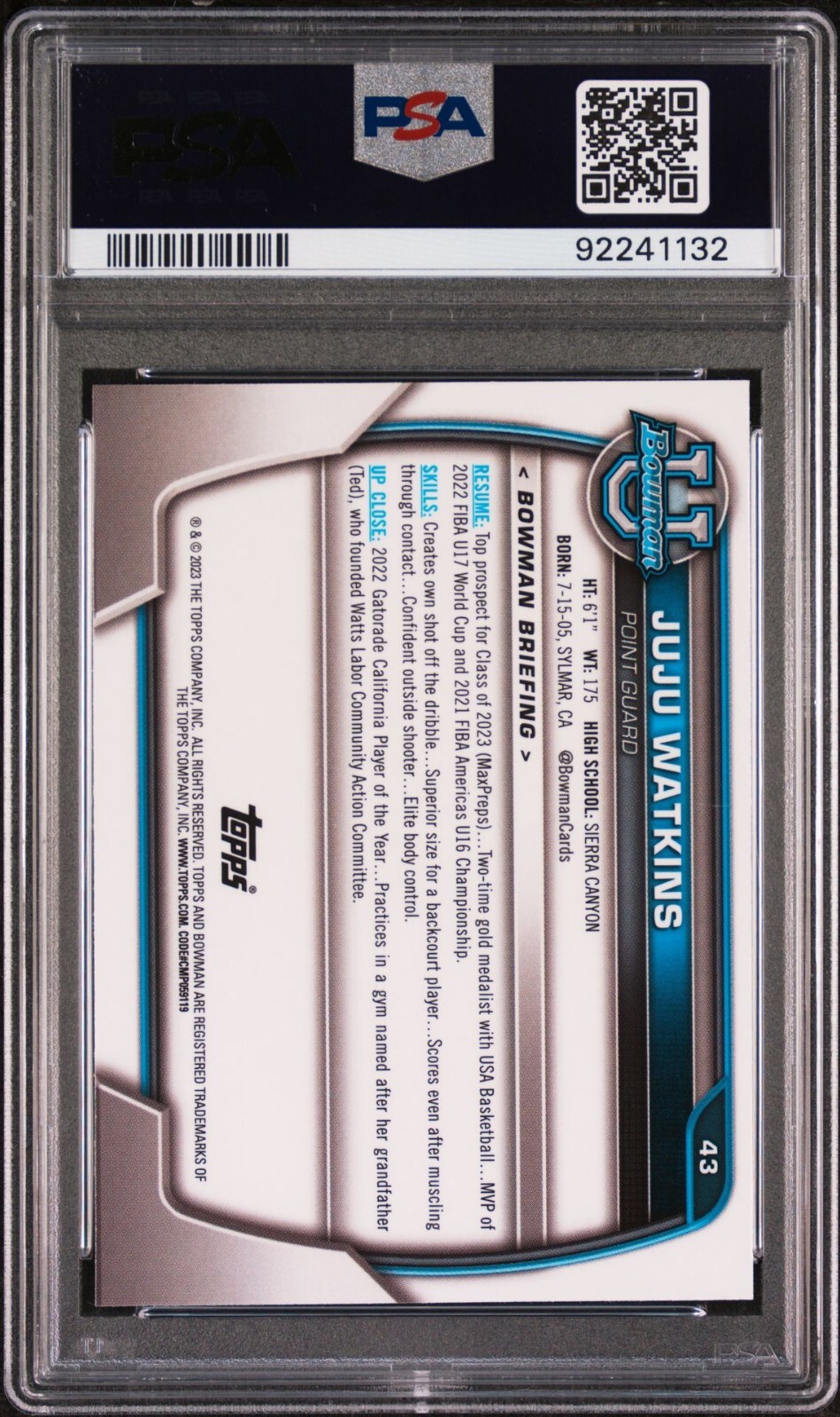 Parallel/Variety:[Base]Features:Rookie, Base SetCard Number:43Set:2022-23 Bowman University ChromeSeason:2022-23Series:Bowman University Chromebrand:ToppsLeague:National Collegiate Athletic Association (NCAA)Player/Athlete:JuJu WatkinsSport:BasketballManufacturer:Topps