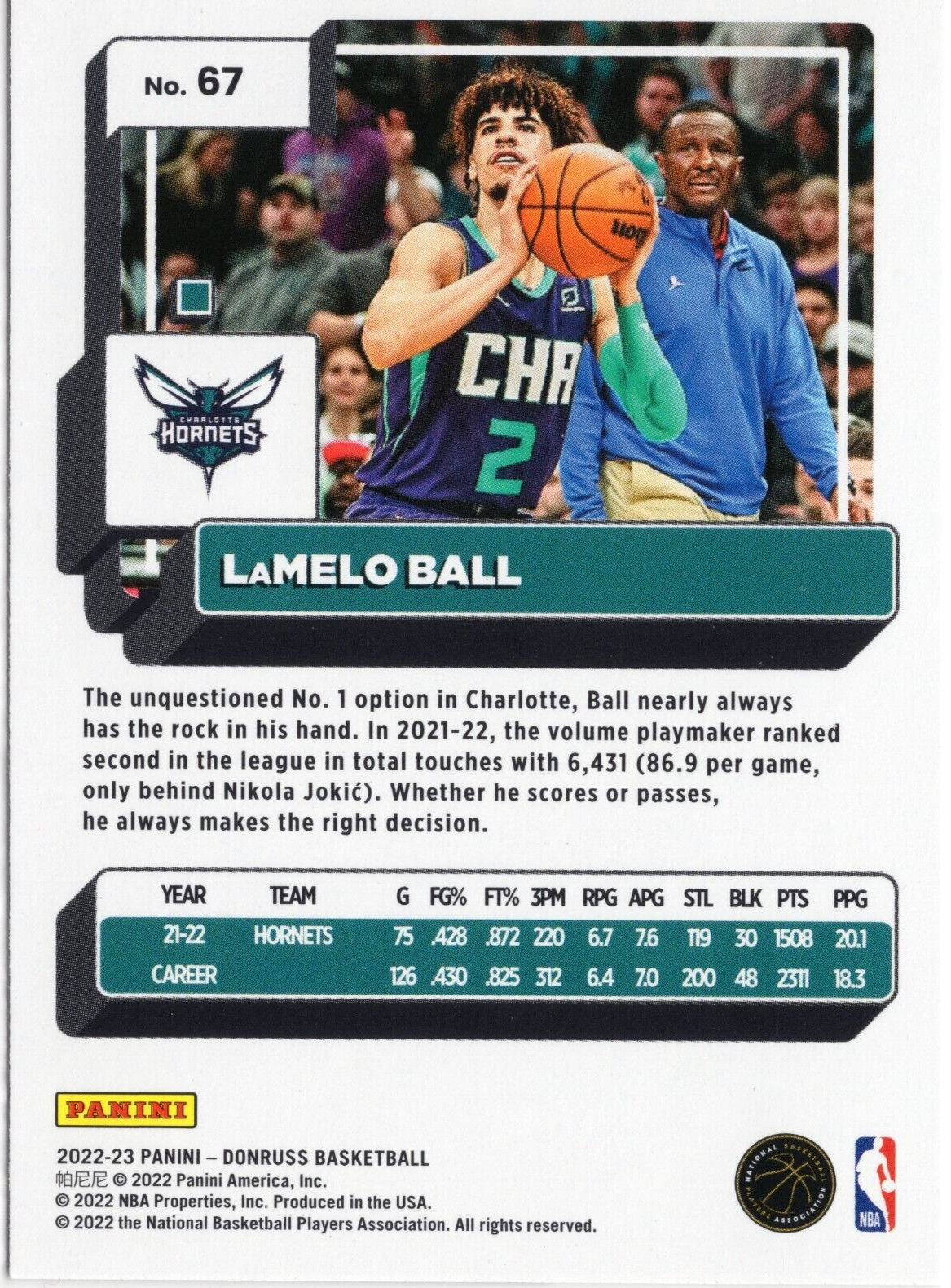 This is a 2022-23 Donruss Basketball trading card featuring LaMelo Ball of the Charlotte Hornets. The card is made of 35 pt. card stock material and has a green laser parallel/variety design. It is a single card from the set and is an original, licensed reprint. The card features LaMelo Ball as a rookie insert and has the card number 67. It is a great addition to any basketball trading card collection, especially for fans of the Charlotte Hornets or LaMelo Ball himself. This card is from the modern era of basketball and was manufactured in the United States by Donruss.