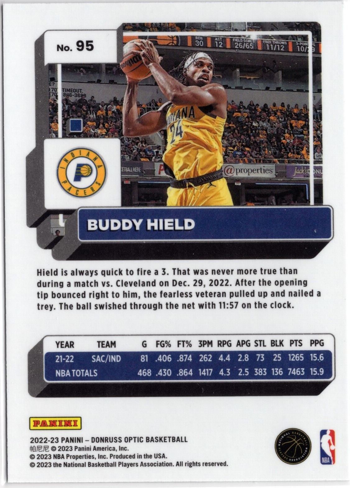 This 2022-23 Donruss Optic card features Buddy Hield of the Indiana Pacers, card number 95. The card is made of 35 Pt. card stock material and is part of the National Basketball Association (NBA) league. It was manufactured in the United States and features English language. The card is from the 2022-23 season and set, and is a standard size sports trading card. It is a parallel/variety Optic card and commemorates the NBA Finals event/tournament. This card is a must-have for any basketball card collector and a great addition to any sports memorabilia collection.
